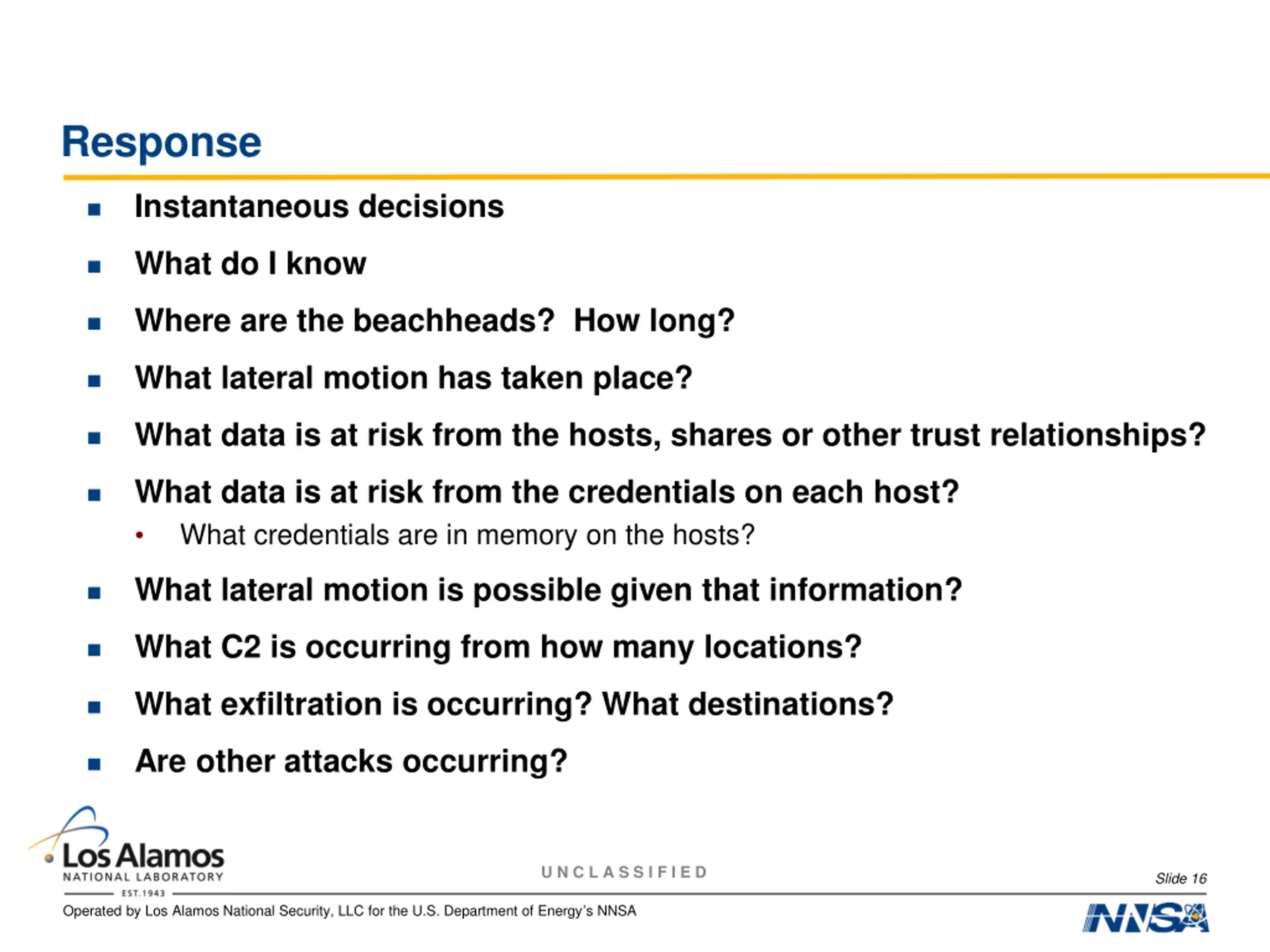 Response Instantaneous decisions What do I know Where are the beachheads? How long? What lateral motion has taken place? What data is at risk from the hosts, shares or other trust relationships? What data is at risk from the credentials on each host? What credentials are in memory on the hosts? What lateral motion is possible given that information? What C2 is occurring from how many locations? What exfiltration is occurring? What destinations? Are other attacks occurring? U N C L A S S I F I E D Slide 16 Operated by Los Alamos National Security, LLC for the U.S. Department of Energy s NNSA