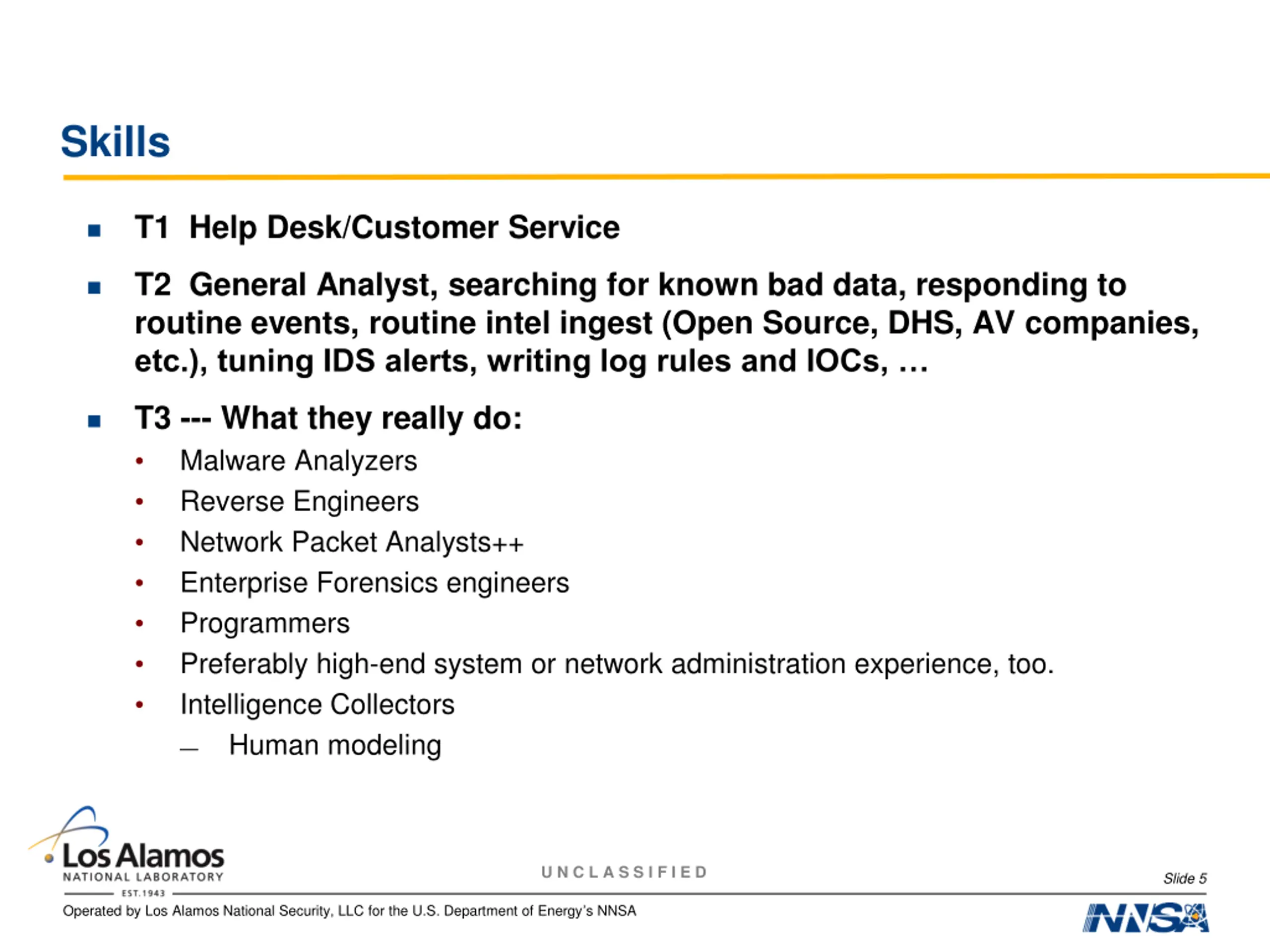 Skills T1 Help Desk/Customer Service T2 General Analyst, searching for known bad data, responding to routine events, routine intel ingest (Open Source, DHS, AV companies, etc.), tuning IDS alerts, writing log rules and IOCs, T3 --- What they really do: Malware Analyzers Reverse Engineers Network Packet Analysts++ Enterprise Forensics engineers Programmers Preferably high-end system or network administration experience, too. Intelligence Collectors Human modeling U N C L A S S I F I E D Slide 5 Operated by Los Alamos National Security, LLC for the U.S. Department of Energy s NNSA