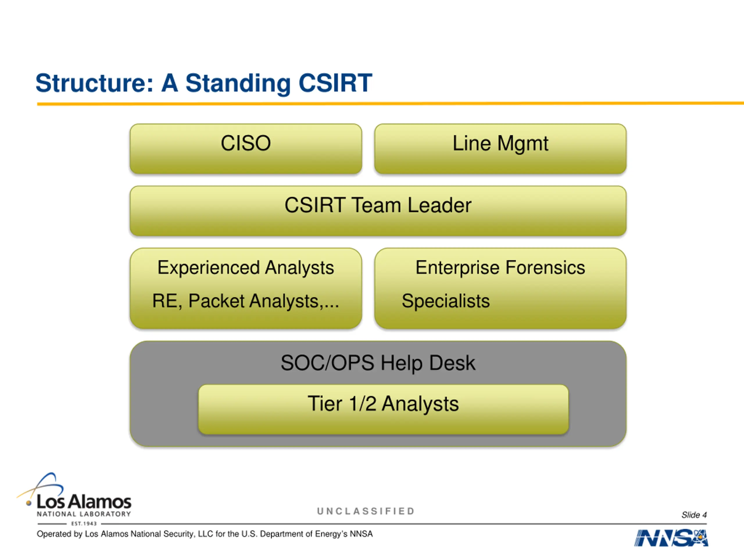 Structure: A Standing CSIRT CISO Line Mgmt CSIRT Team Leader Experienced Analysts Enterprise Forensics RE, Packet Analysts,... Specialists SOC/OPS Help Desk Tier 1/2 Analysts U N C L A S S I F I E D Slide 4 Operated by Los Alamos National Security, LLC for the U.S. Department of Energy s NNSA