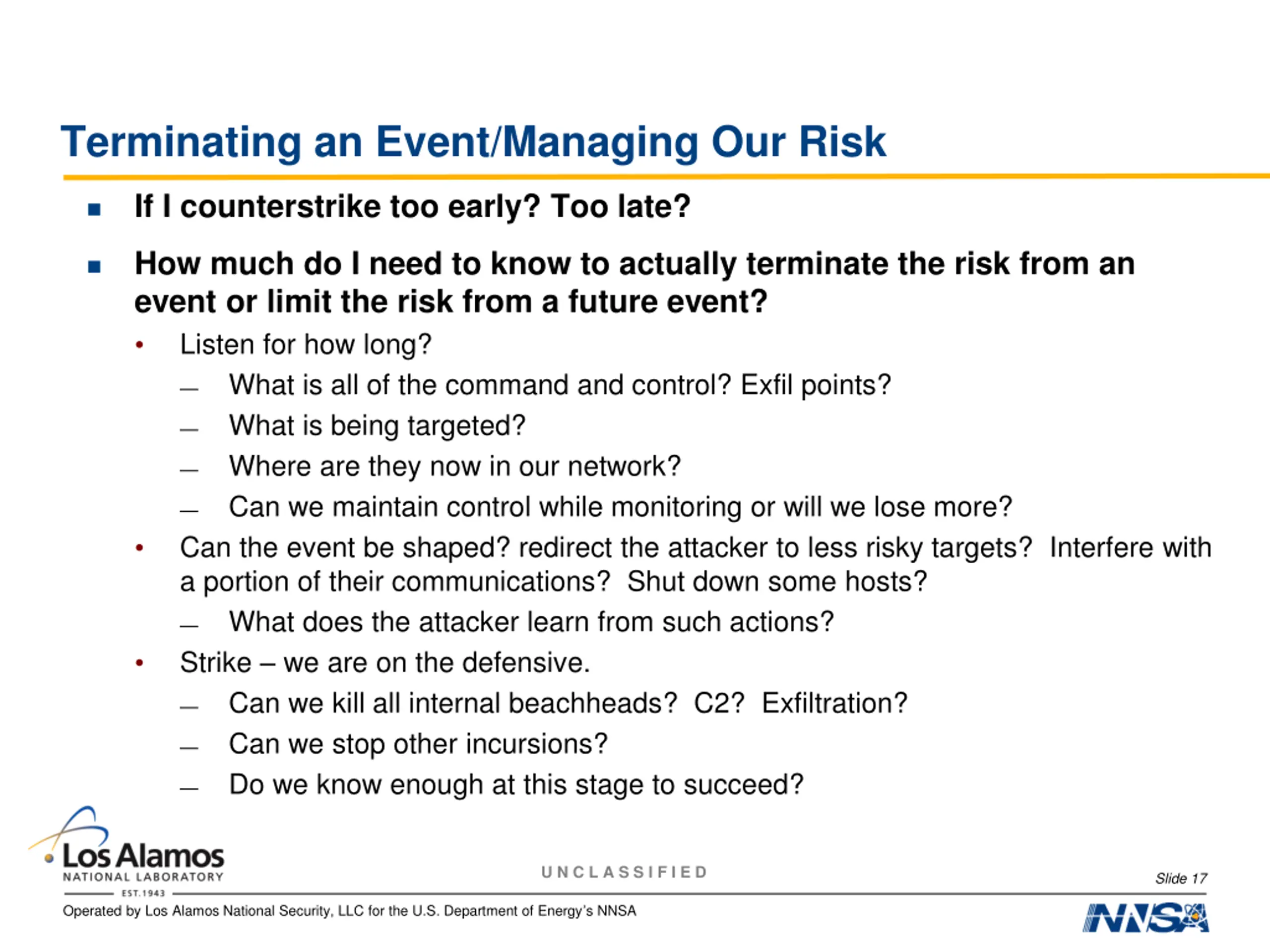 Terminating an Event/Managing Our Risk If I counterstrike too early? Too late? How much do I need to know to actually terminate the risk from an event or limit the risk from a future event? Listen for how long? What is all of the command and control? Exfil points? What is being targeted? Where are they now in our network? Can we maintain control while monitoring or will we lose more? Can the event be shaped? redirect the attacker to less risky targets? Interfere with a portion of their communications? Shut down some hosts? What does the attacker learn from such actions? Strike we are on the defensive. Can we kill all internal beachheads? C2? Exfiltration? Can we stop other incursions? Do we know enough at this stage to succeed? U N C L A S S I F I E D Slide 17 Operated by Los Alamos National Security, LLC for the U.S. Department of Energy s NNSA