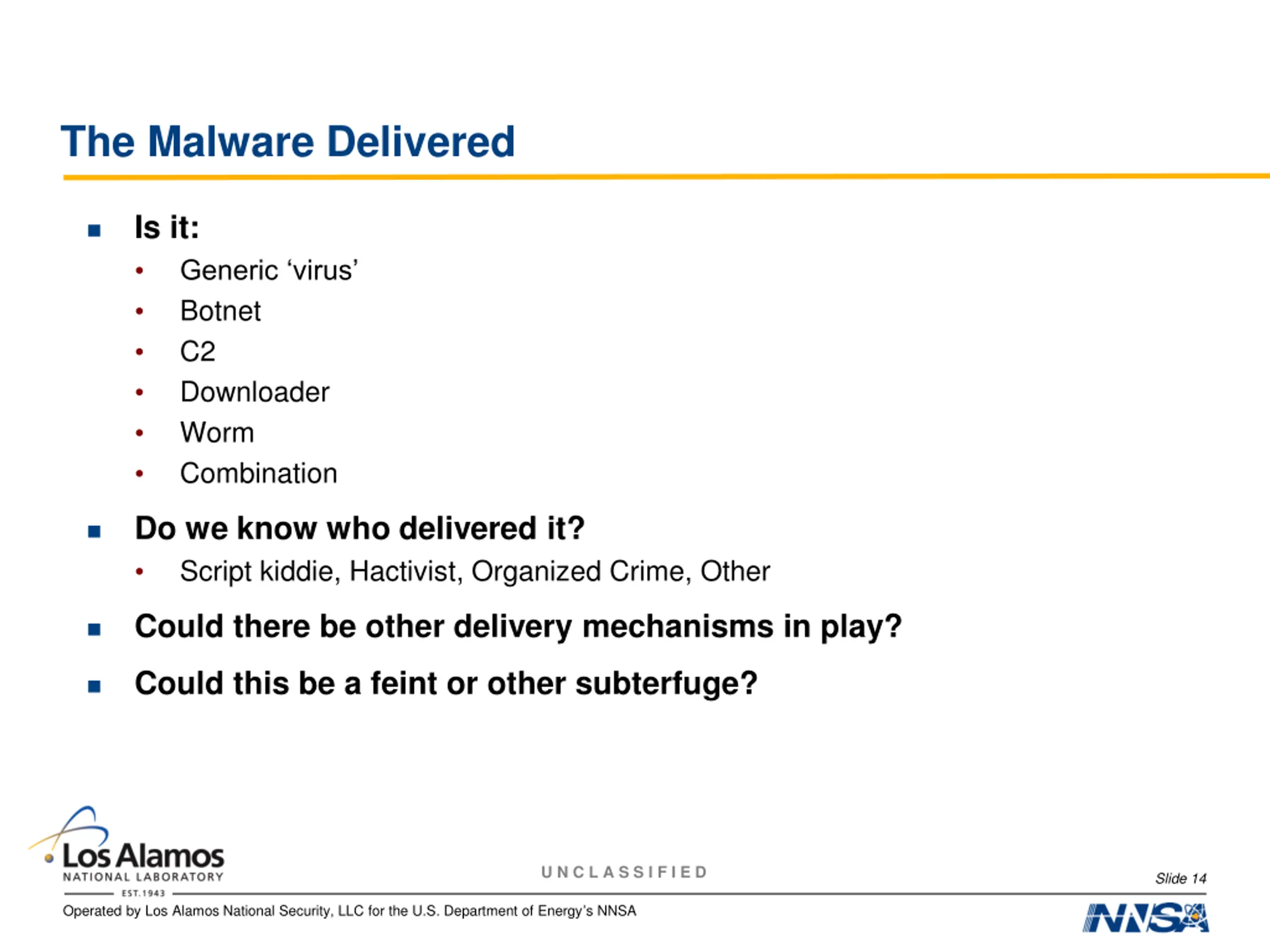 The Malware Delivered Is it: Generic virus Botnet C2 Downloader Worm Combination Do we know who delivered it? Script kiddie, Hactivist, Organized Crime, Other Could there be other delivery mechanisms in play? Could this be a feint or other subterfuge? U N C L A S S I F I E D Slide 14 Operated by Los Alamos National Security, LLC for the U.S. Department of Energy s NNSA
