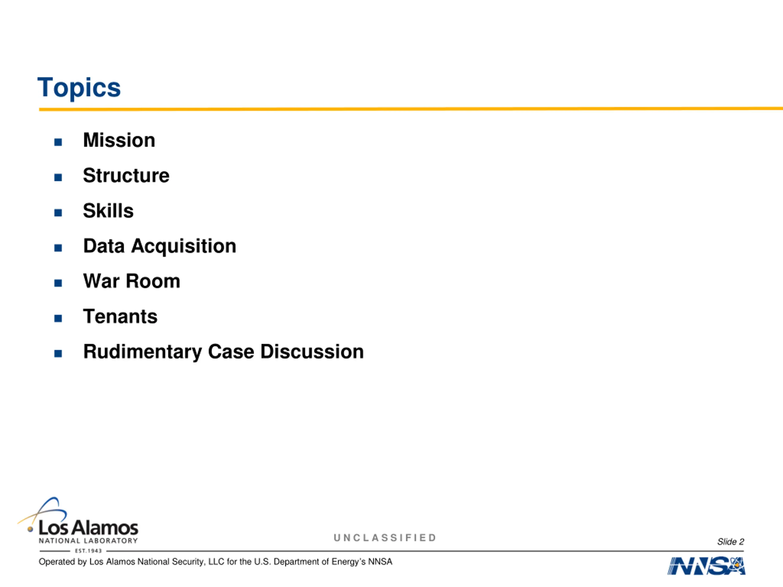 Topics Mission Structure Skills Data Acquisition War Room Tenants Rudimentary Case Discussion U N C L A S S I F I E D Slide 2 Operated by Los Alamos National Security, LLC for the U.S. Department of Energy s NNSA