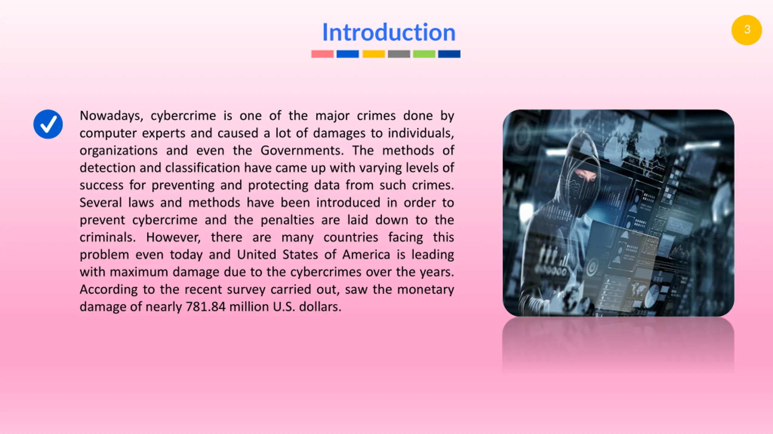 Introduction 3 Nowadays, cybercrime is one of the major crimes done by computer experts and caused a lot of damages to individuals, organizations and even the Governments. The methods of detection and classification have came up with varying levels of success for preventing and protecting data from such crimes. Several laws and methods have been introduced in order to prevent cybercrime and the penalties are laid down to the criminals. However, there are many countries facing this problem even today and United States of America is leading with maximum damage due to the cybercrimes over the years. According to the recent survey carried out, saw the monetary damage of nearly 781.84 million U.S. dollars.