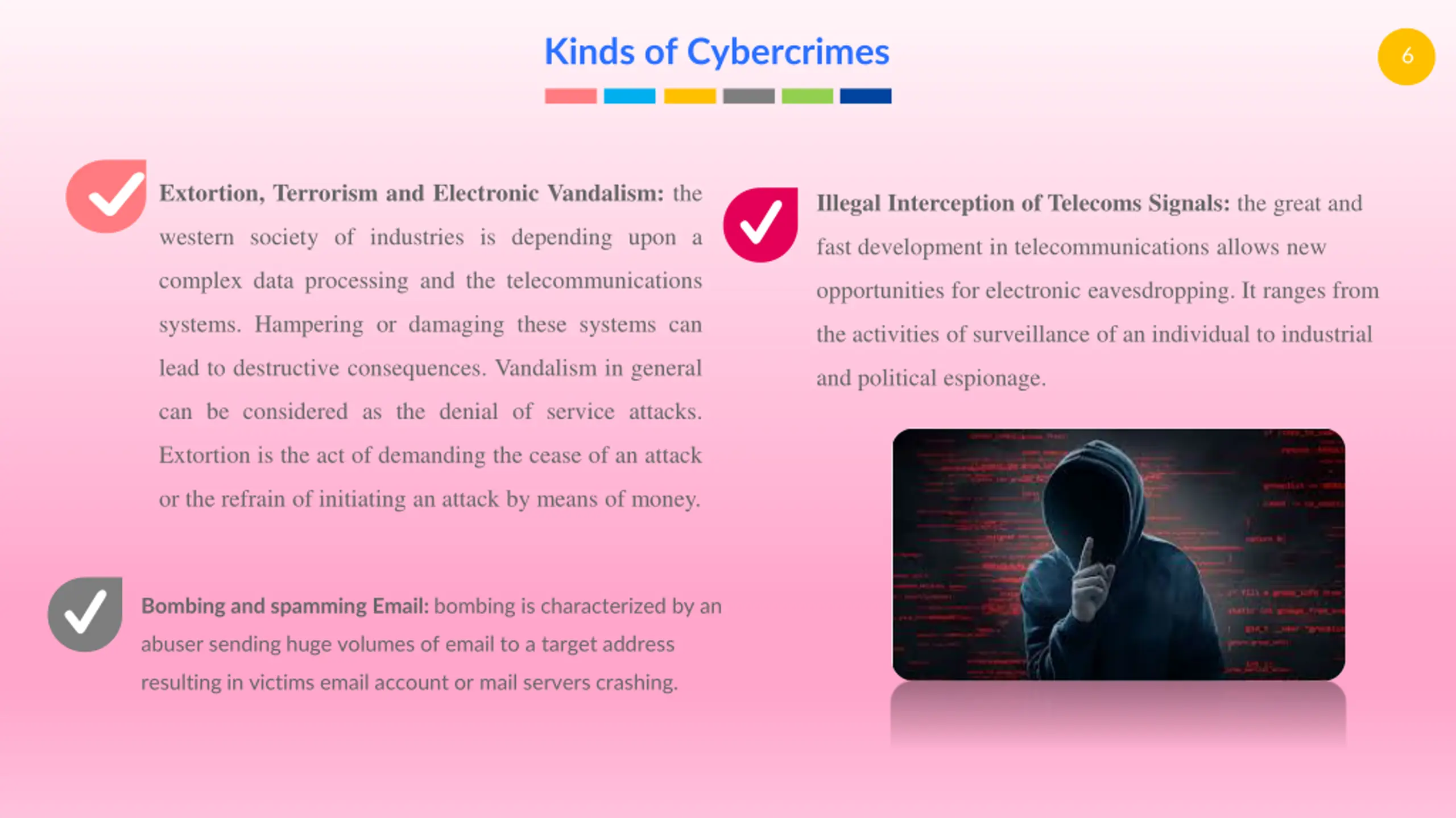 Kinds of Cybercrimes 6 Extortion, Terrorism and Electronic Vandalism: the Illegal Interception of Telecoms Signals: the great and western society of industries is depending upon a fast development in telecommunications allows new complex data processing and the telecommunications opportunities for electronic eavesdropping. It ranges from systems. Hampering or damaging these systems can the activities of surveillance of an individual to industrial lead to destructive consequences. Vandalism in general and political espionage. can be considered as the denial of service attacks. Extortion is the act of demanding the cease of an attack or the refrain of initiating an attack by means of money. Bombing and spamming Email: bombing is characterized by an abuser sending huge volumes of email to a target address resulting in victims email account or mail servers crashing.
