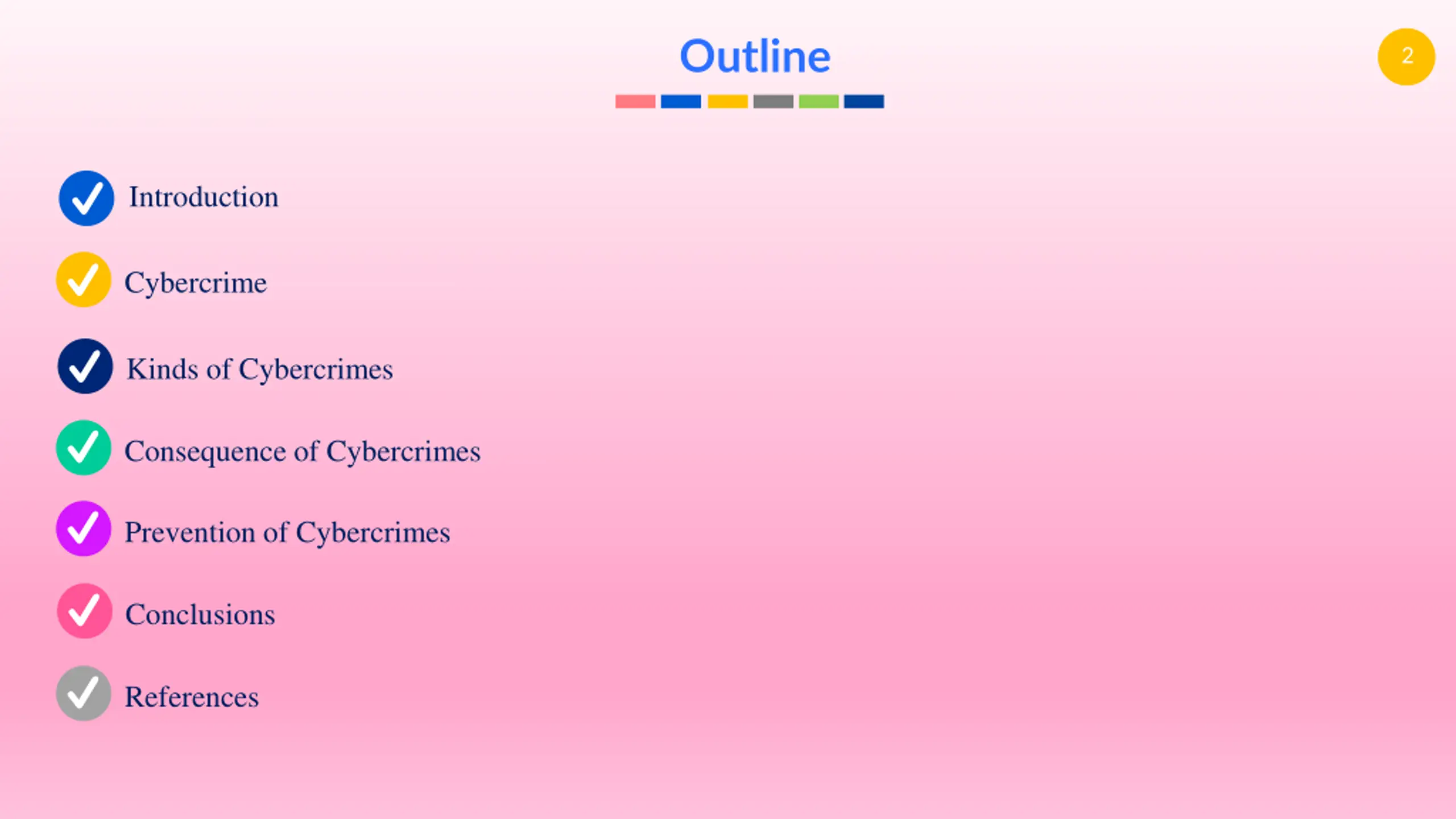 Outline 2 Introduction Cybercrime Kinds of Cybercrimes Consequence of Cybercrimes Prevention of Cybercrimes Conclusions References