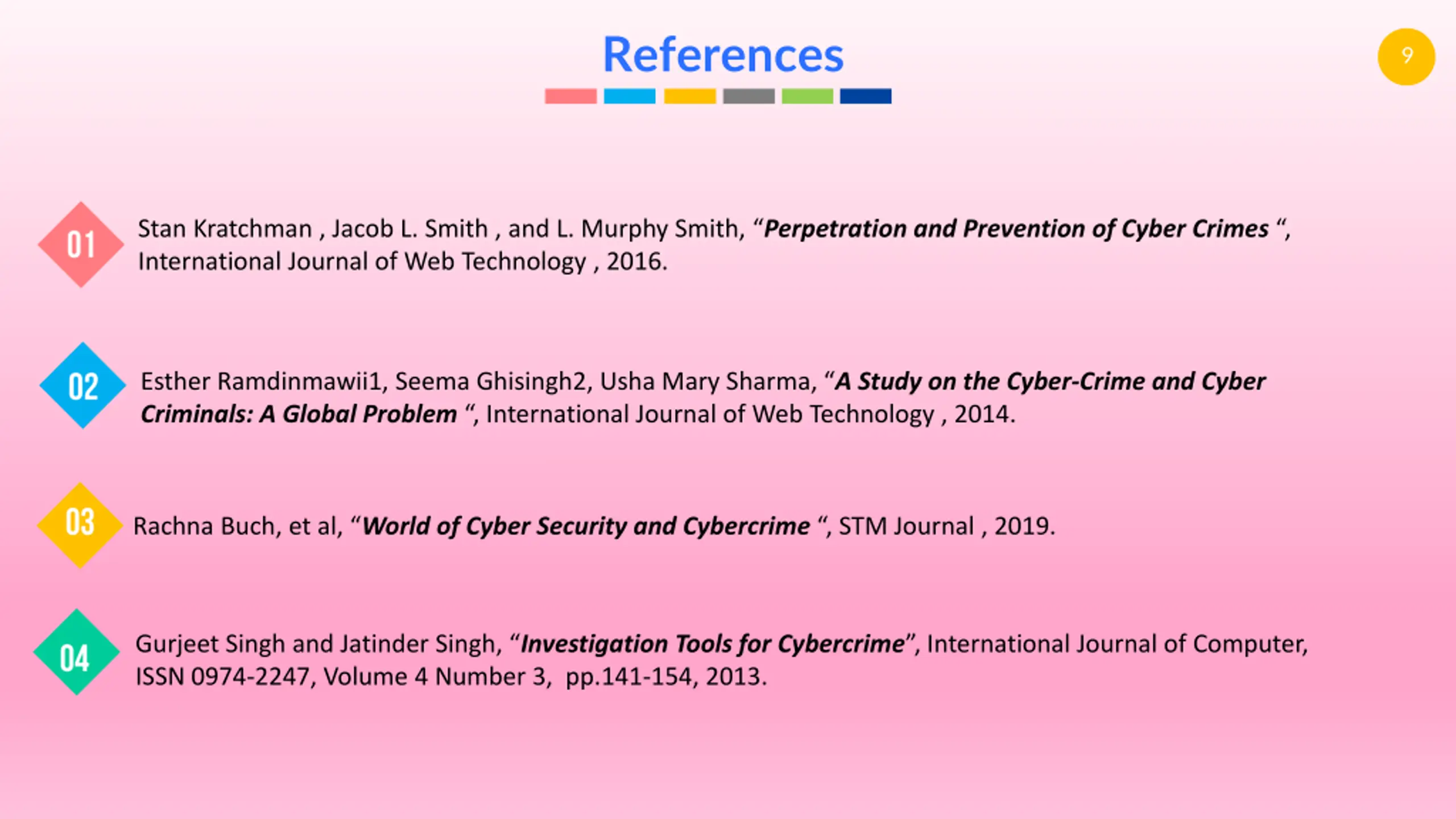 References 9 Stan Kratchman , Jacob L. Smith , and L. Murphy Smith, Perpetration and Prevention of Cyber Crimes , International Journal of Web Technology , 2016. Esther Ramdinmawii1, Seema Ghisingh2, Usha Mary Sharma, A Study on the Cyber-Crime and Cyber Criminals: A Global Problem , International Journal of Web Technology , 2014. Rachna Buch, et al, World of Cyber Security and Cybercrime , STM Journal , 2019. Gurjeet Singh and Jatinder Singh, Investigation Tools for Cybercrime , International Journal of Computer, ISSN 0974-2247, Volume 4 Number 3, pp.141-154, 2013.