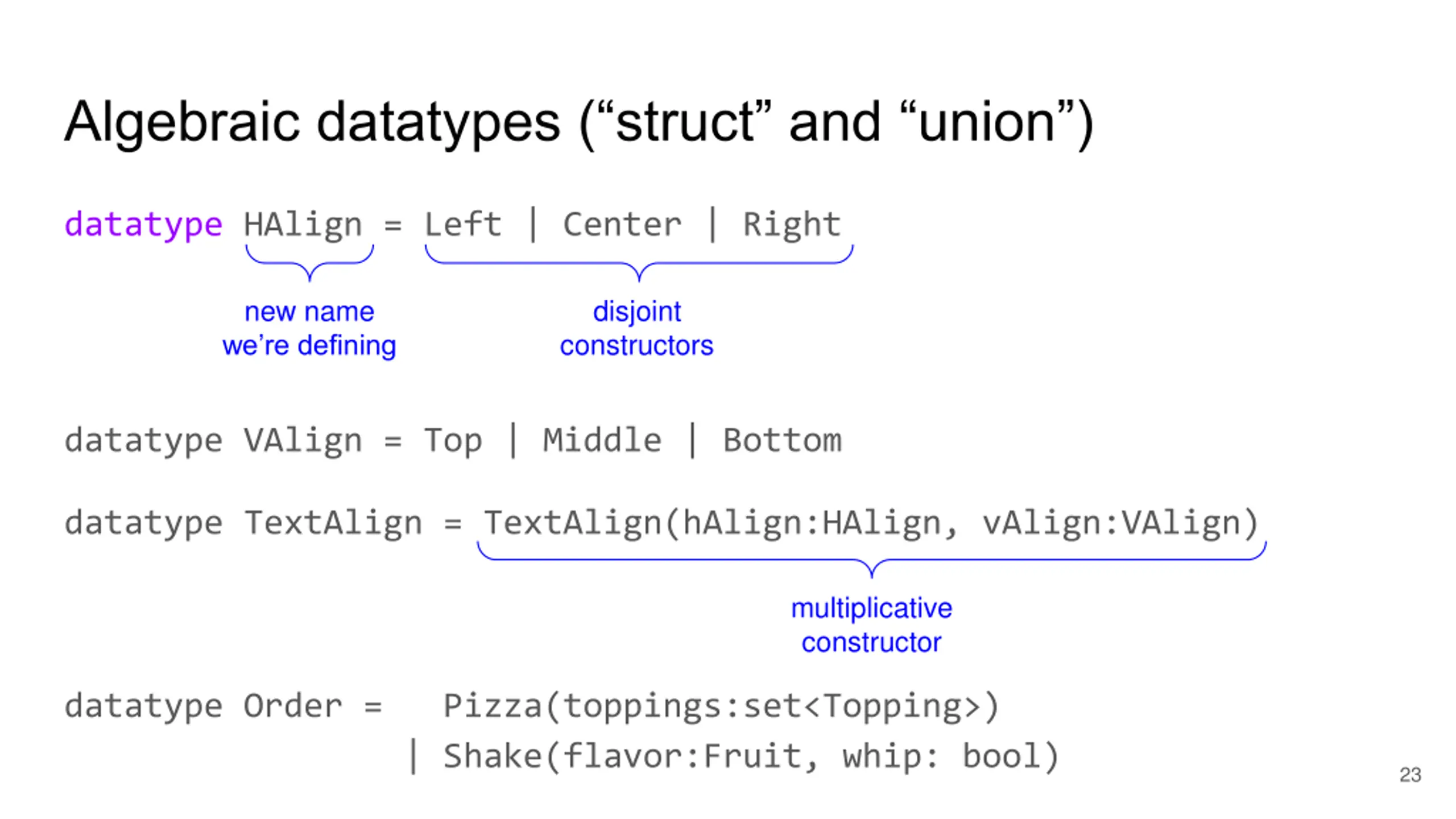 Algebraic datatypes (struct and union) datatype HAlign = Left | Center | Right new name we re defining disjoint constructors datatype VAlign = Top | Middle | Bottom datatype TextAlign = TextAlign(hAlign:HAlign, vAlign:VAlign) multiplicative constructor datatype Order = Pizza(toppings:set<Topping>) | Shake(flavor:Fruit, whip: bool) 23