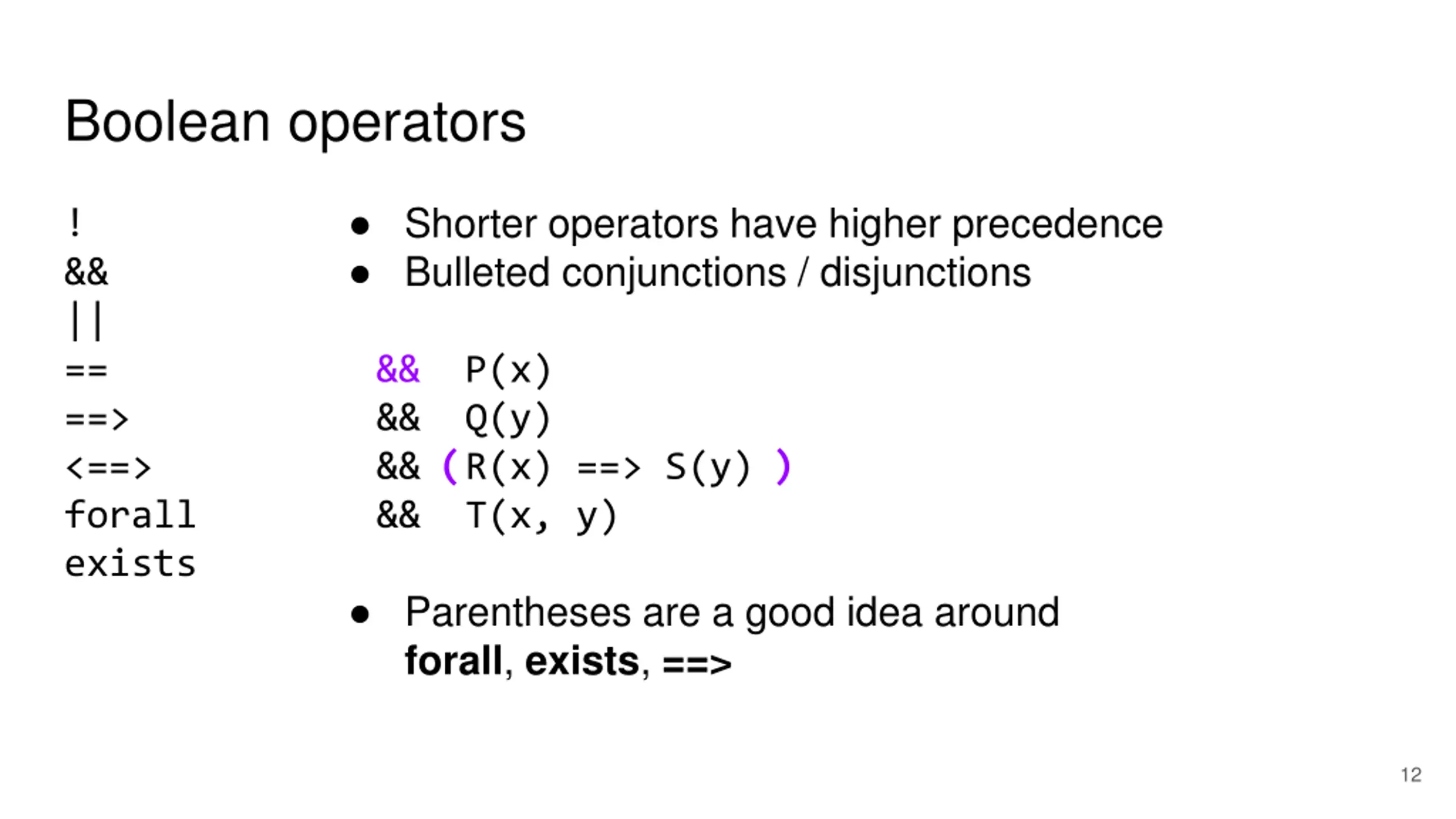 Boolean operators Shorter operators have higher precedence Bulleted conjunctions / disjunctions ! && || == ==> <==> forall exists && && Q(y) && R(x) ==> S(y) && T(x, y) P(x) ( ) Parentheses are a good idea around forall, exists, ==> 12