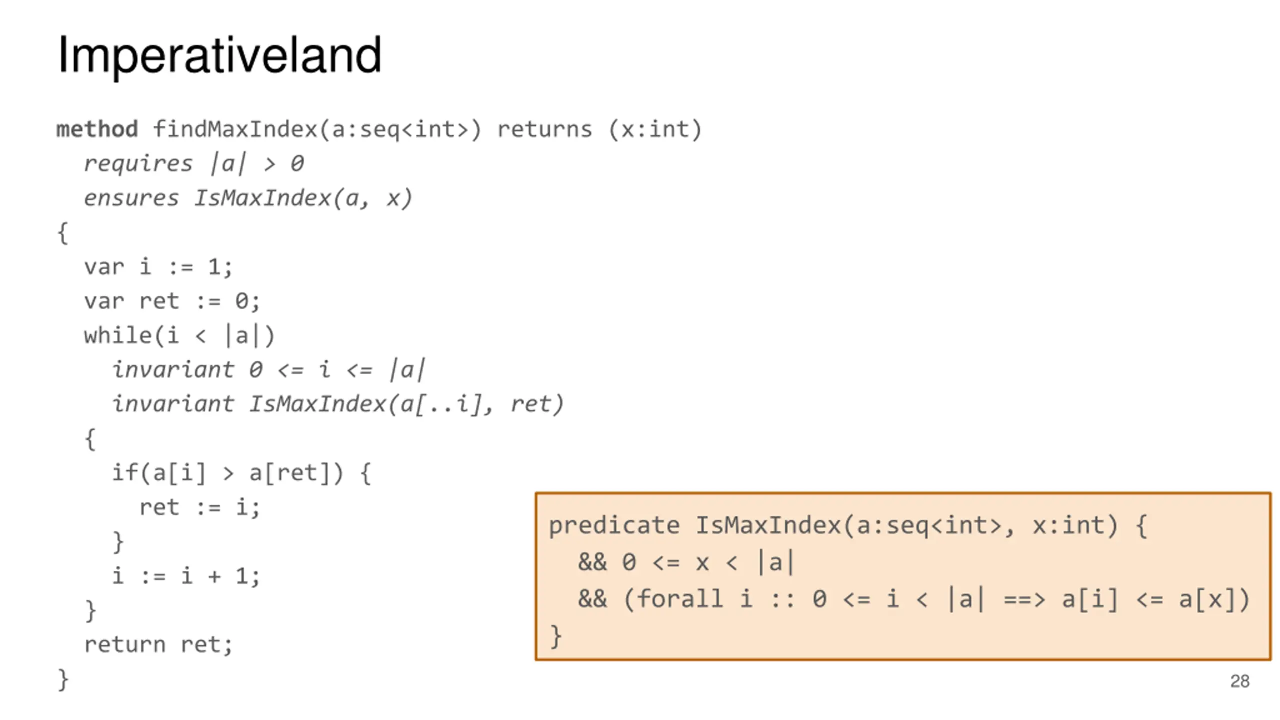 Detour to Imperativeland predicate IsMaxIndex(a:seq<int>, x:int) { && 0 <= x < |a| && (forall i :: 0 <= i < |a| ==> a[i] <= a[x]) } lemma findMaxIndex(a:seq<int>) returns (x:int) requires |a| > 0 ensures IsMaxIndex(a, x) { var i := 1; var ret := 0; while(i < |a|) invariant 0 <= i <= |a| 27