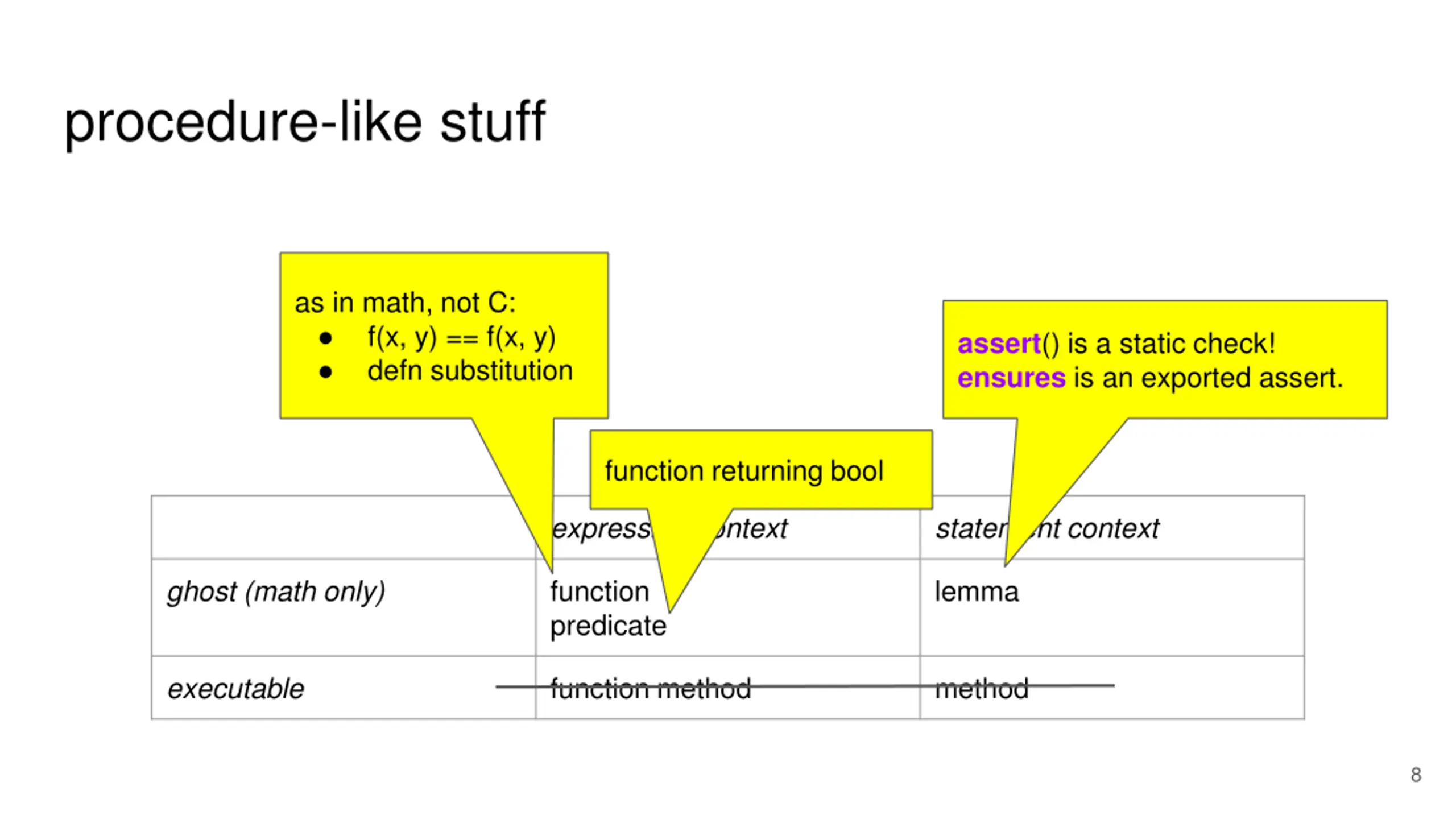 procedure-like stuff as in math, not C: f(x, y) == f(x, y) defn substitution assert() is a static check! ensures is an exported assert. function returning bool expression context statement context ghost (math only) function predicate lemma executable function method method 8