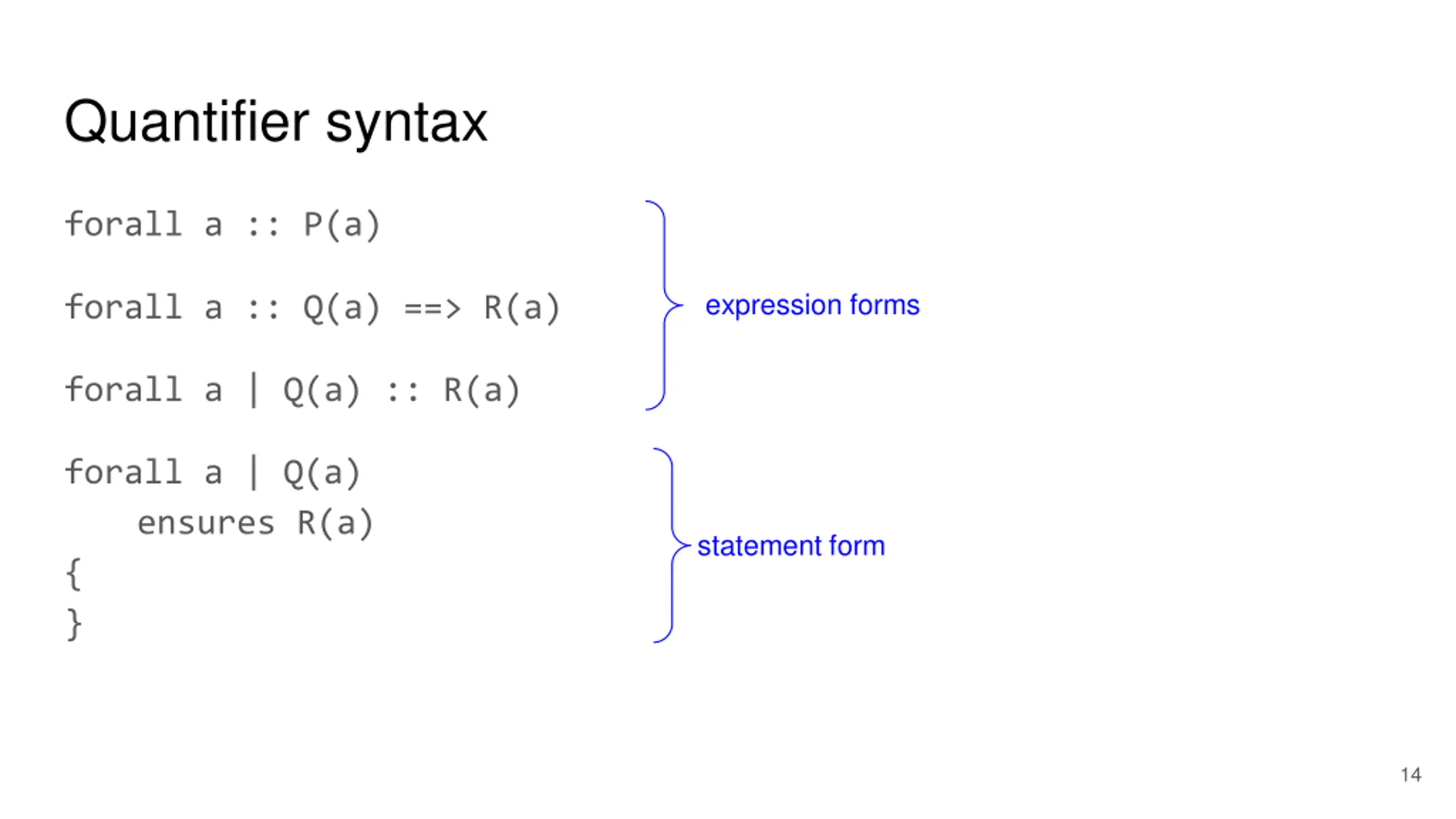 Quantifier syntax forall a :: P(a) expression forms forall a :: Q(a) ==> R(a) forall a | Q(a) :: R(a) forall a | Q(a) ensures R(a) { } statement form 14