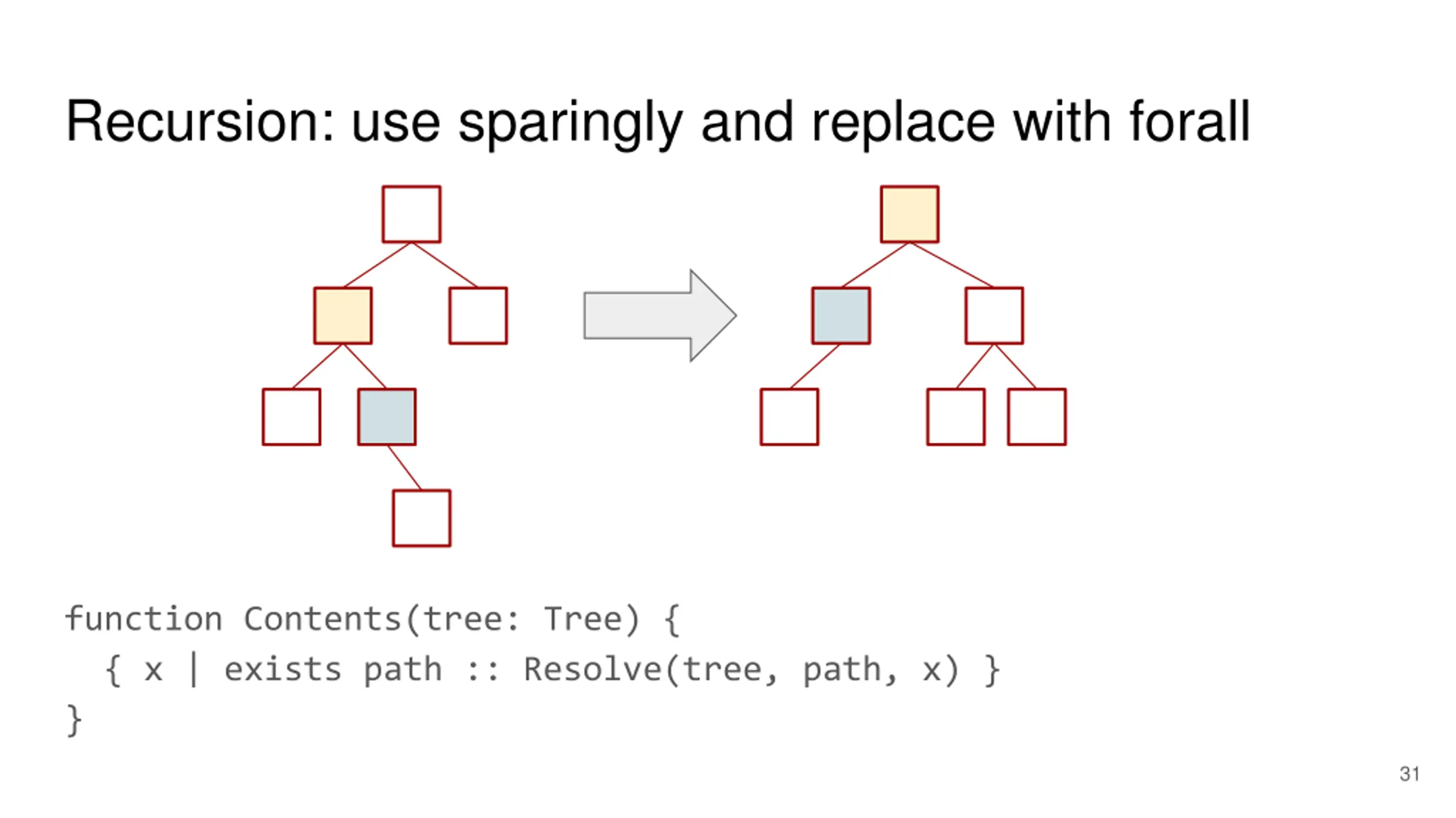 Recursion: use sparingly and replace with forall function Contents(tree: Tree) { { x | exists path :: Resolve(tree, path, x) } } 31