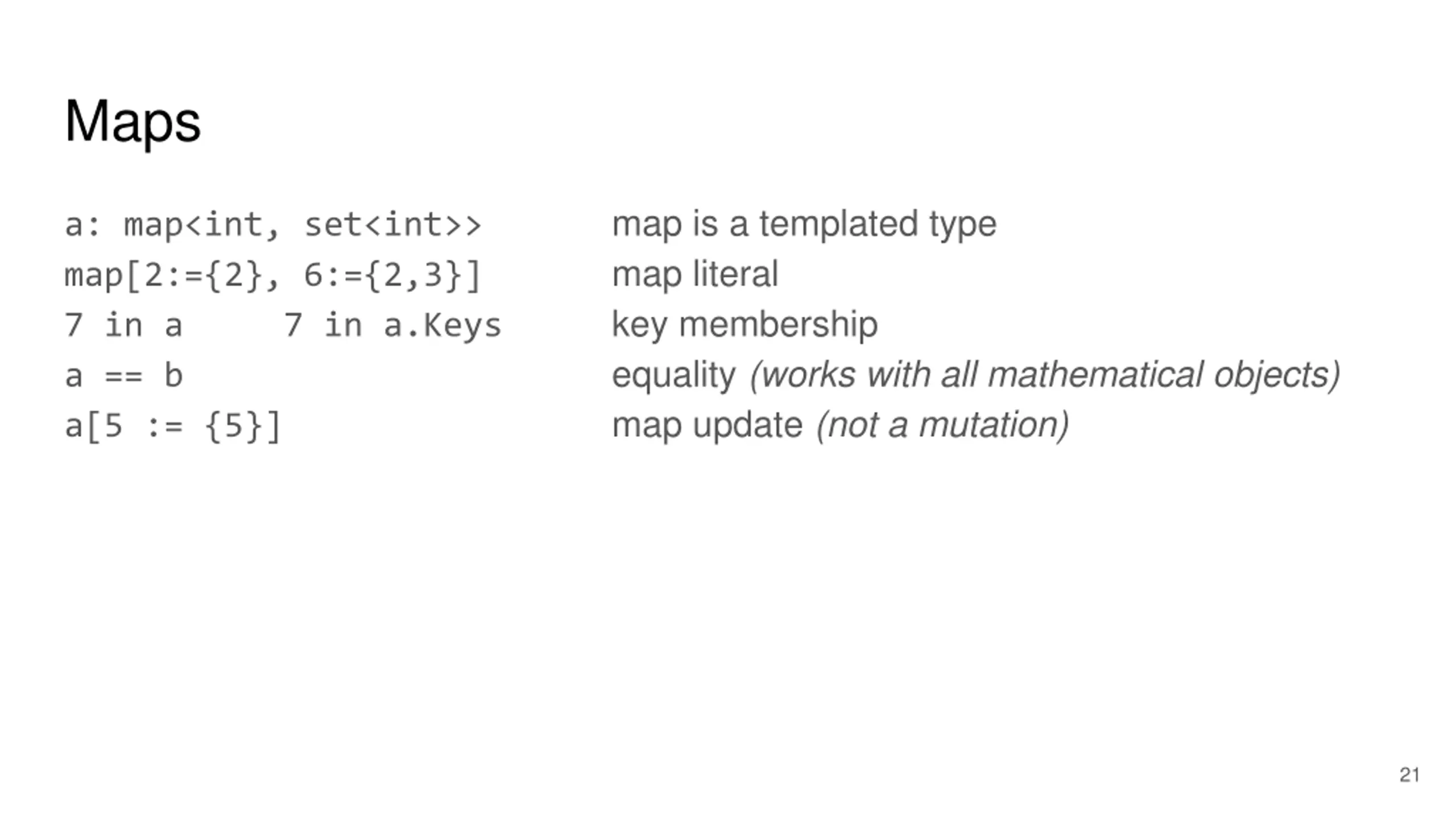 Maps map is a templated type map literal key membership equality (works with all mathematical objects) map update (not a mutation) a: map<int, set<int>> map[2:={2}, 6:={2,3}] 7 in a 7 in a.Keys a == b a[5 := {5}] 21