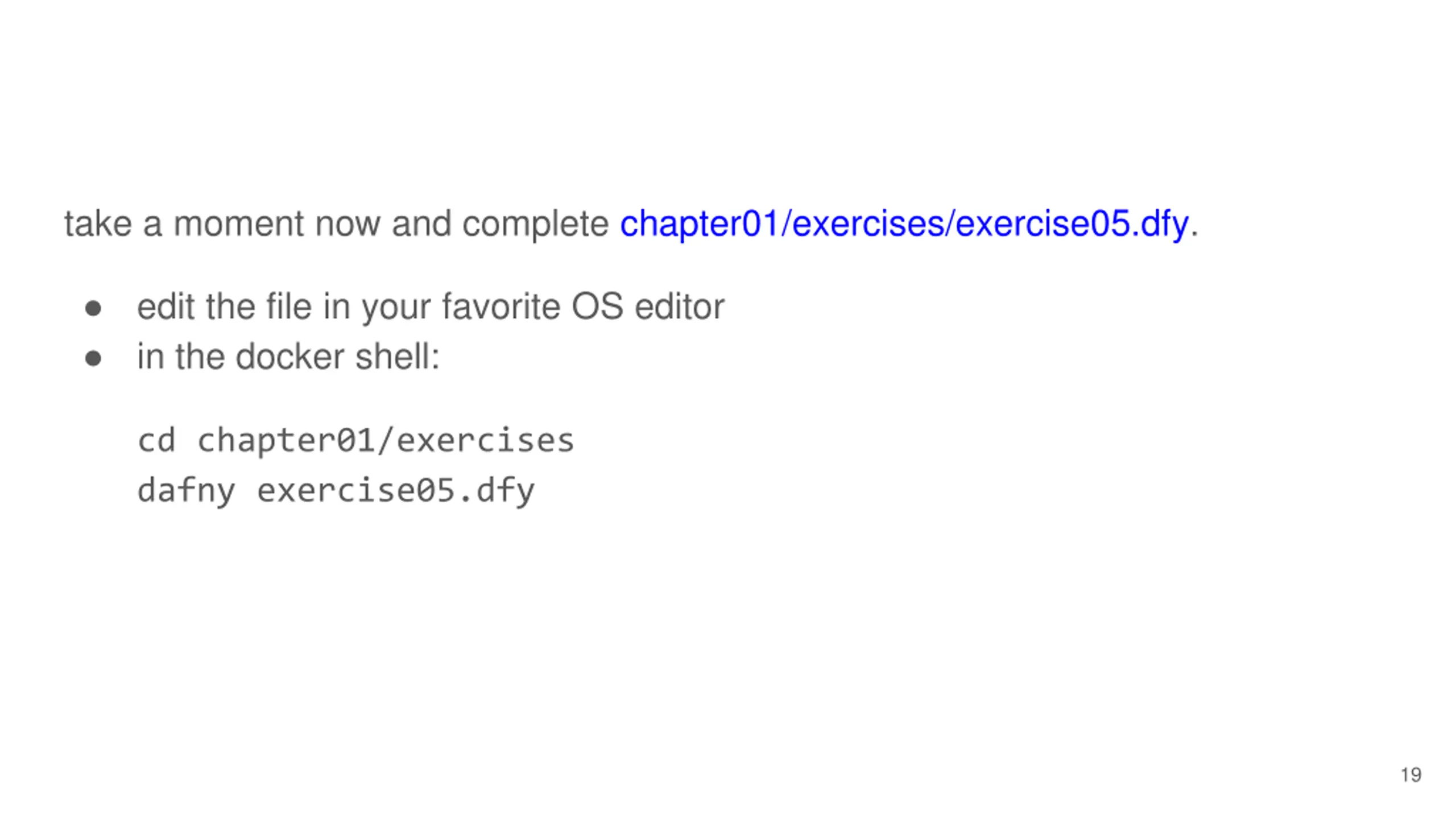 take a moment now and complete chapter01/exercises/exercise05.dfy. edit the file in your favorite OS editor in the docker shell: cd chapter01/exercises dafny exercise05.dfy 19