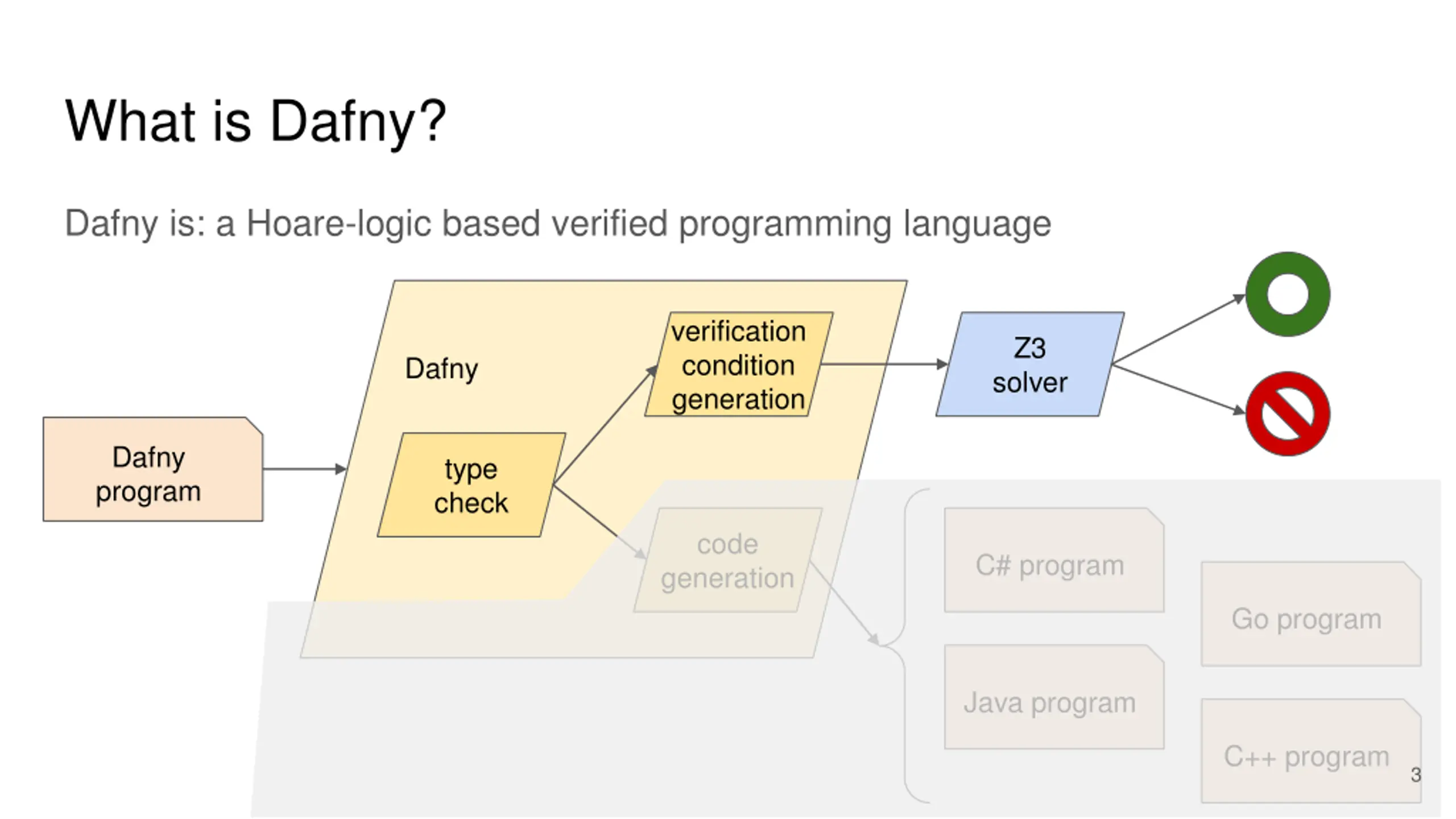 What is Dafny? Dafny is: a Hoare-logic based verified programming language verification condition generation Z3 Dafny solver Dafny program type check code C# program generation Go program Java program C++ program 3