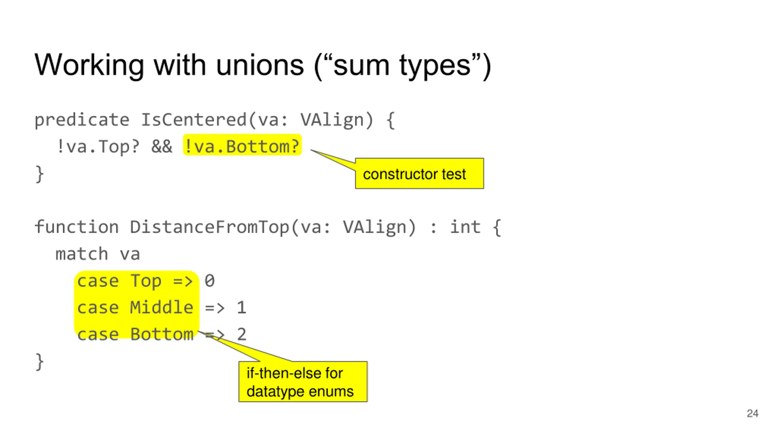 Working with unions (sum types) predicate IsCentered(va: VAlign) { !va.Top? && !va.Bottom? } constructor test function DistanceFromTop(va: VAlign) : int { match va case Top => 0 case Middle => 1 case Bottom => 2 } if-then-else for datatype enums 24