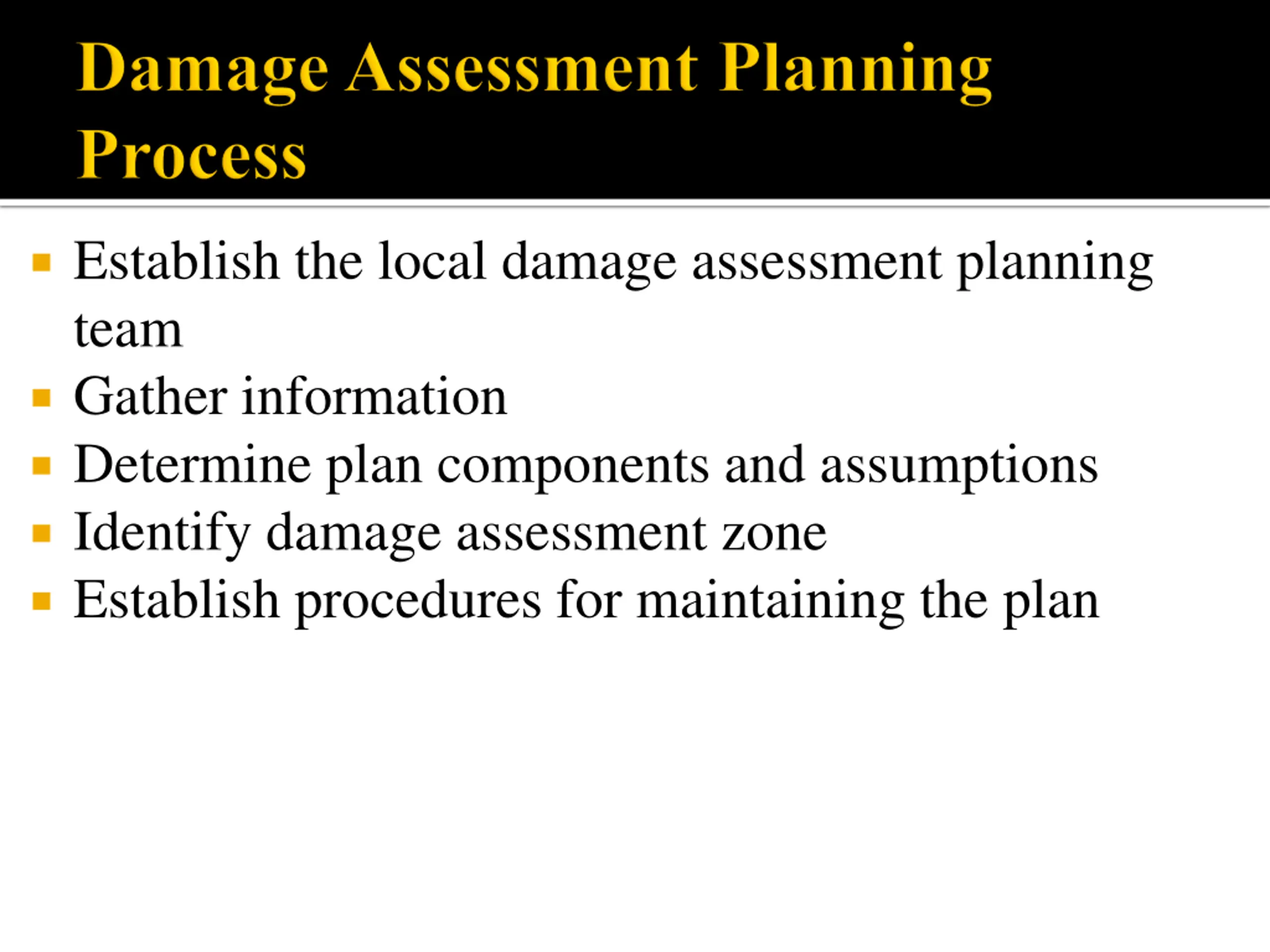 Establish the local damage assessment planning team Gather information Determine plan components and assumptions Identify damage assessment zone Establish procedures for maintaining the plan