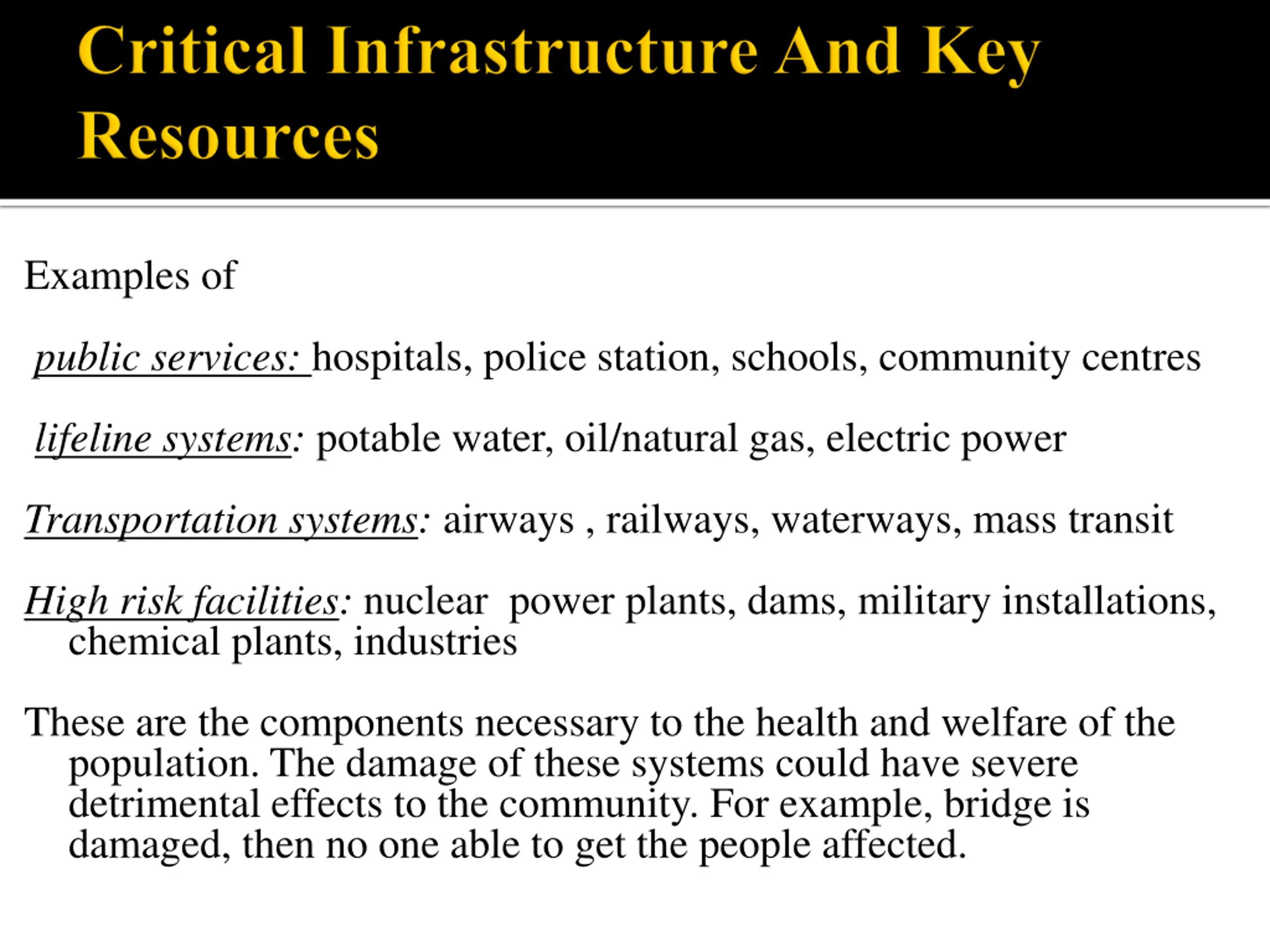 Examples of public services: hospitals, police station, schools, community centres lifeline systems: potable water, oil/natural gas, electric power Transportation systems: airways , railways, waterways, mass transit High risk facilities: nuclear power plants, dams, military installations, chemical plants, industries These are the components necessary to the health and welfare of the population. The damage of these systems could have severe detrimental effects to the community. For example, bridge is damaged, then no one able to get the people affected.