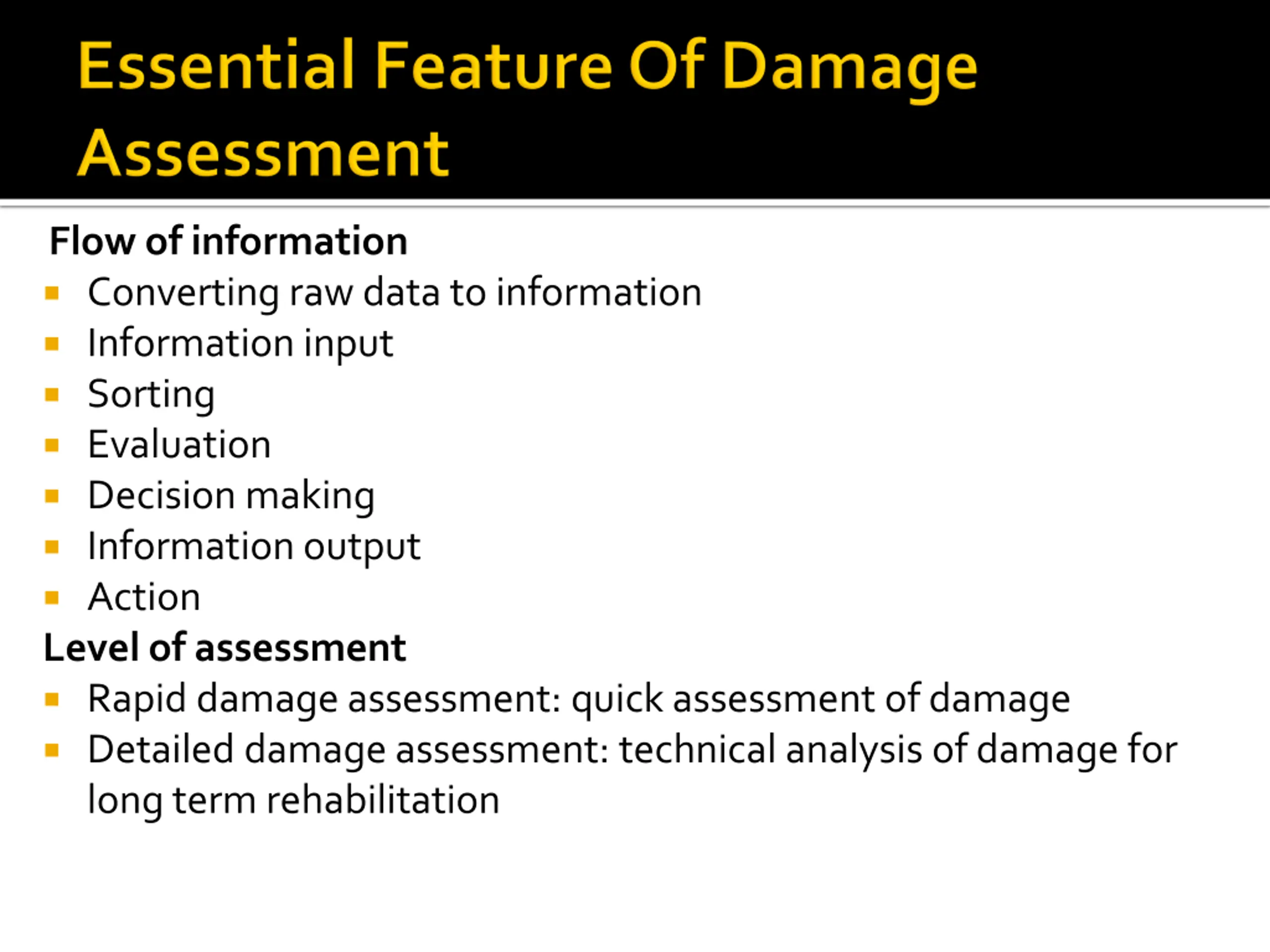 Flow of information Converting raw data to information Information input Sorting Evaluation Decision making Information output Action Level of assessment Rapid damage assessment: quick assessment of damage Detailed damage assessment: technical analysis of damage for long term rehabilitation