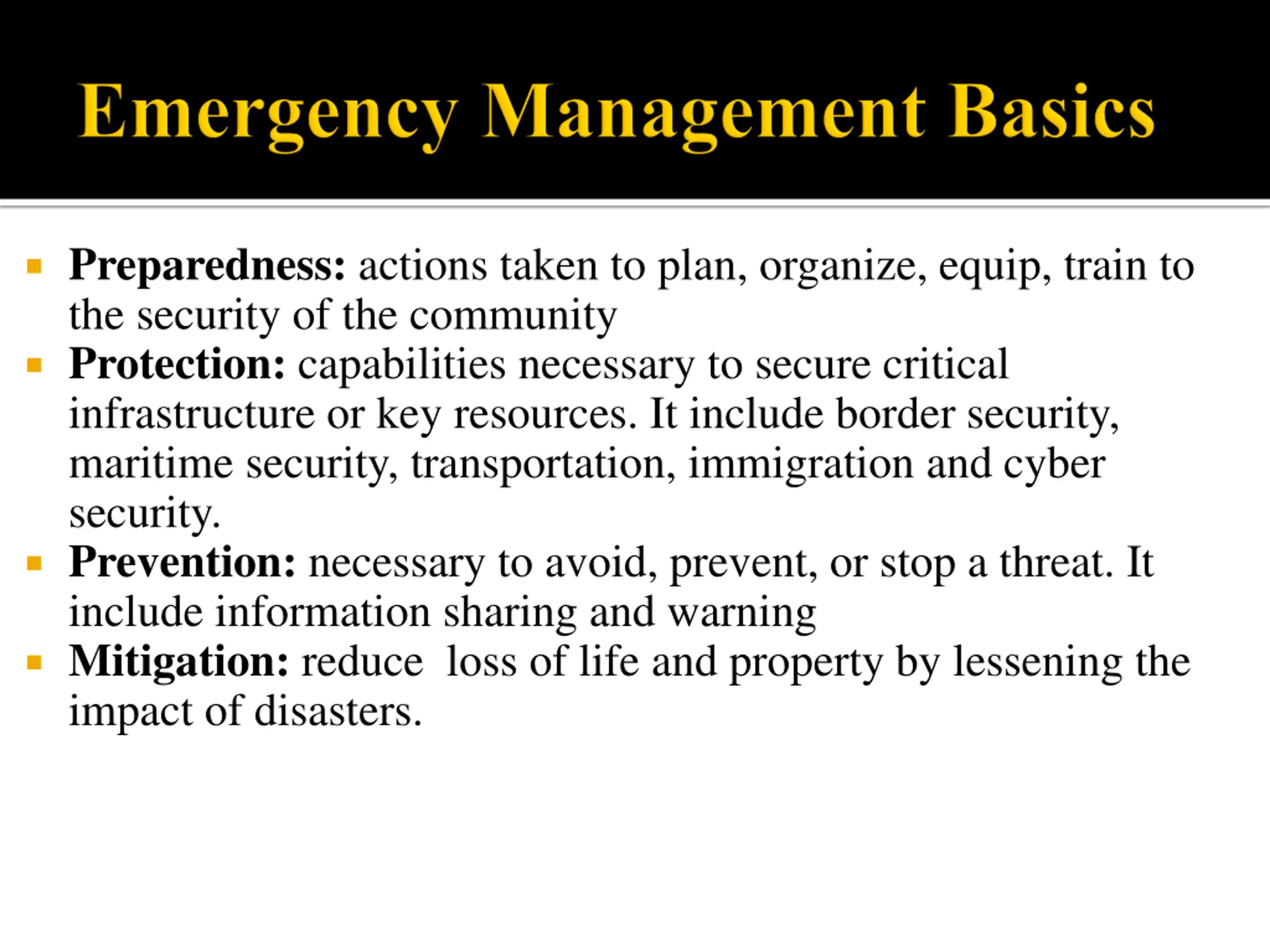Preparedness: actions taken to plan, organize, equip, train to the security of the community Protection: capabilities necessary to secure critical infrastructure or key resources. It include border security, maritime security, transportation, immigration and cyber security. Prevention: necessary to avoid, prevent, or stop a threat. It include information sharing and warning Mitigation: reduce loss of life and property by lessening the impact of disasters.