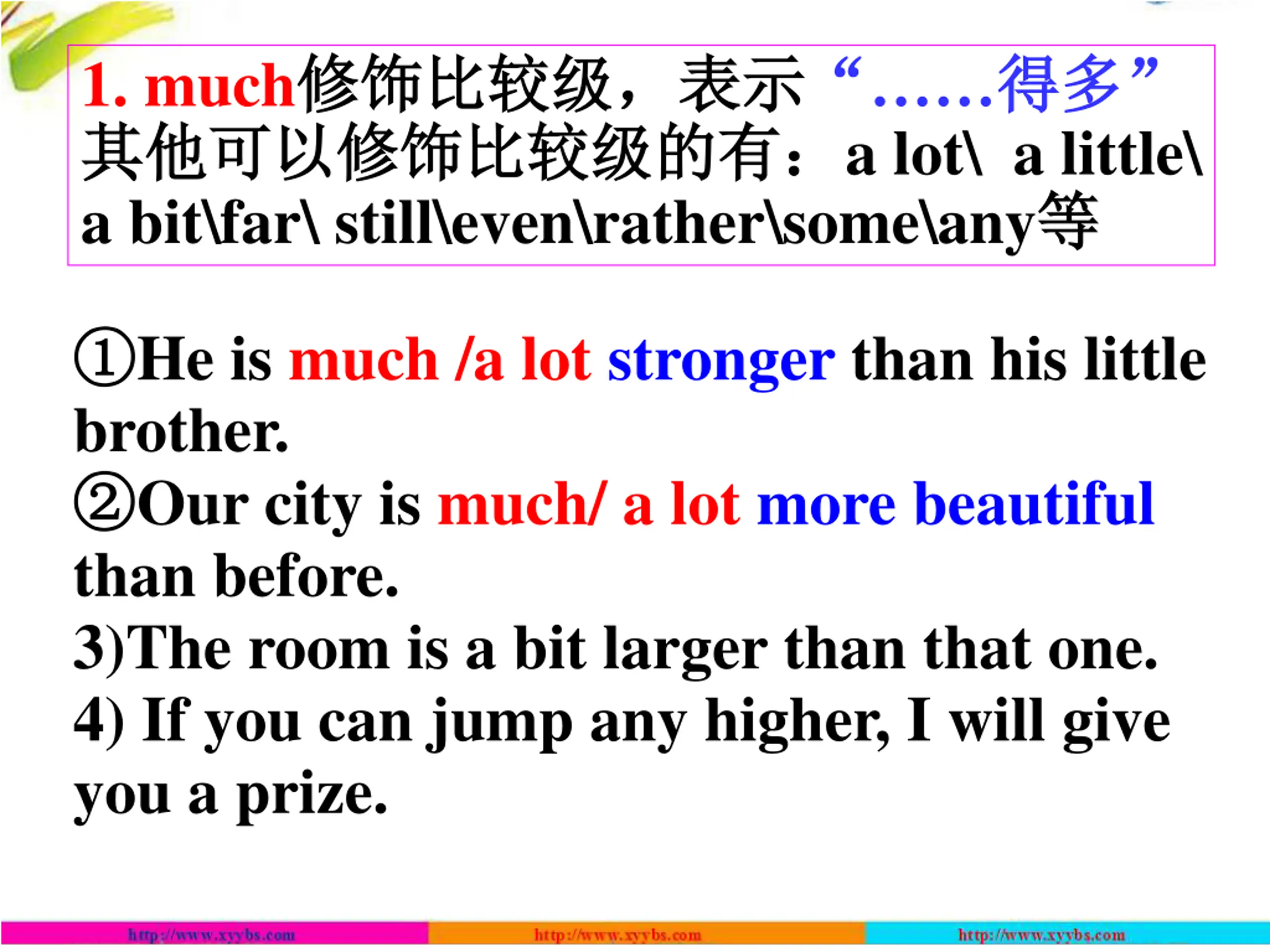 1. much a lot\ a little\ a bit\far\ still\even\rather\some\any He is much /a lot stronger than his little brother. Our city is much/ a lot more beautiful than before. 3)The room is a bit larger than that one. 4) If you can jump any higher, I will give you a prize.