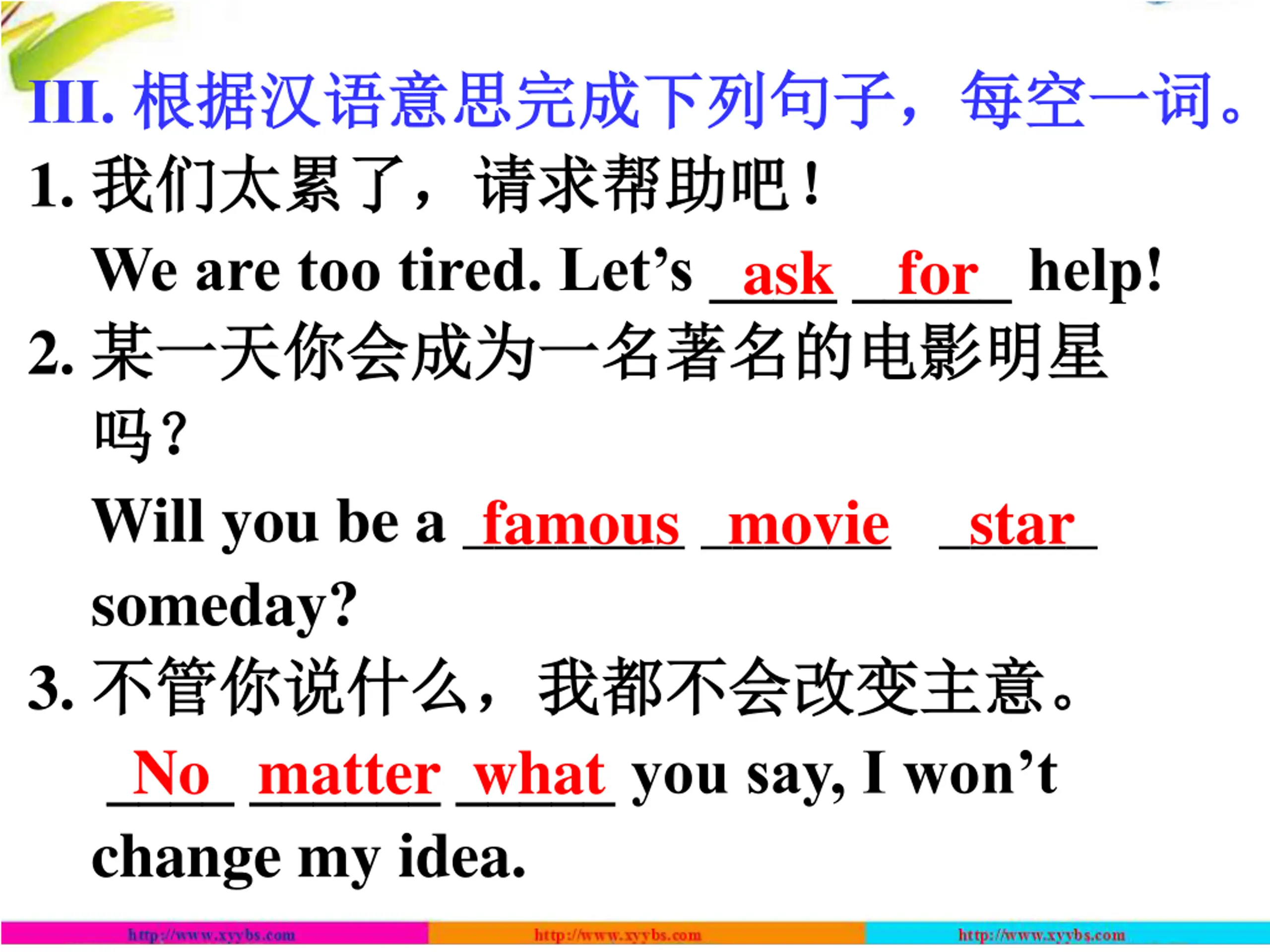 . 1. We are too tired. Let s ____ _____ help! 2. Will you be a _______ ______ _____ someday? 3. ____ ______ _____ you say, I won t change my idea. ask for famous movie star No matter what