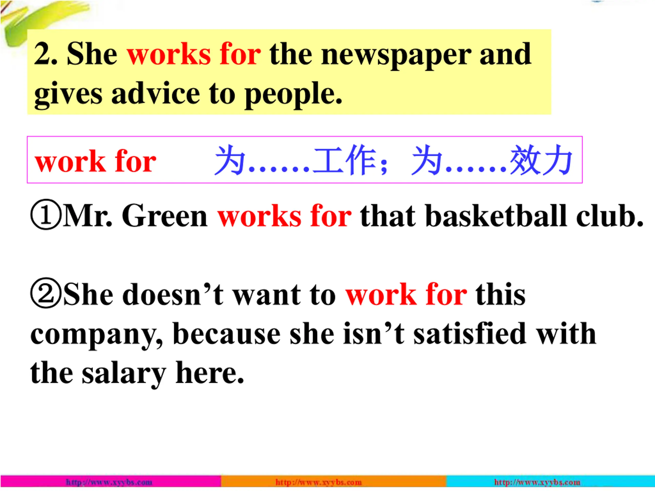 2. She works for the newspaper and gives advice to people. work for Mr. Green works for that basketball club. She doesn t want to work for this company, because she isn t satisfied with the salary here.