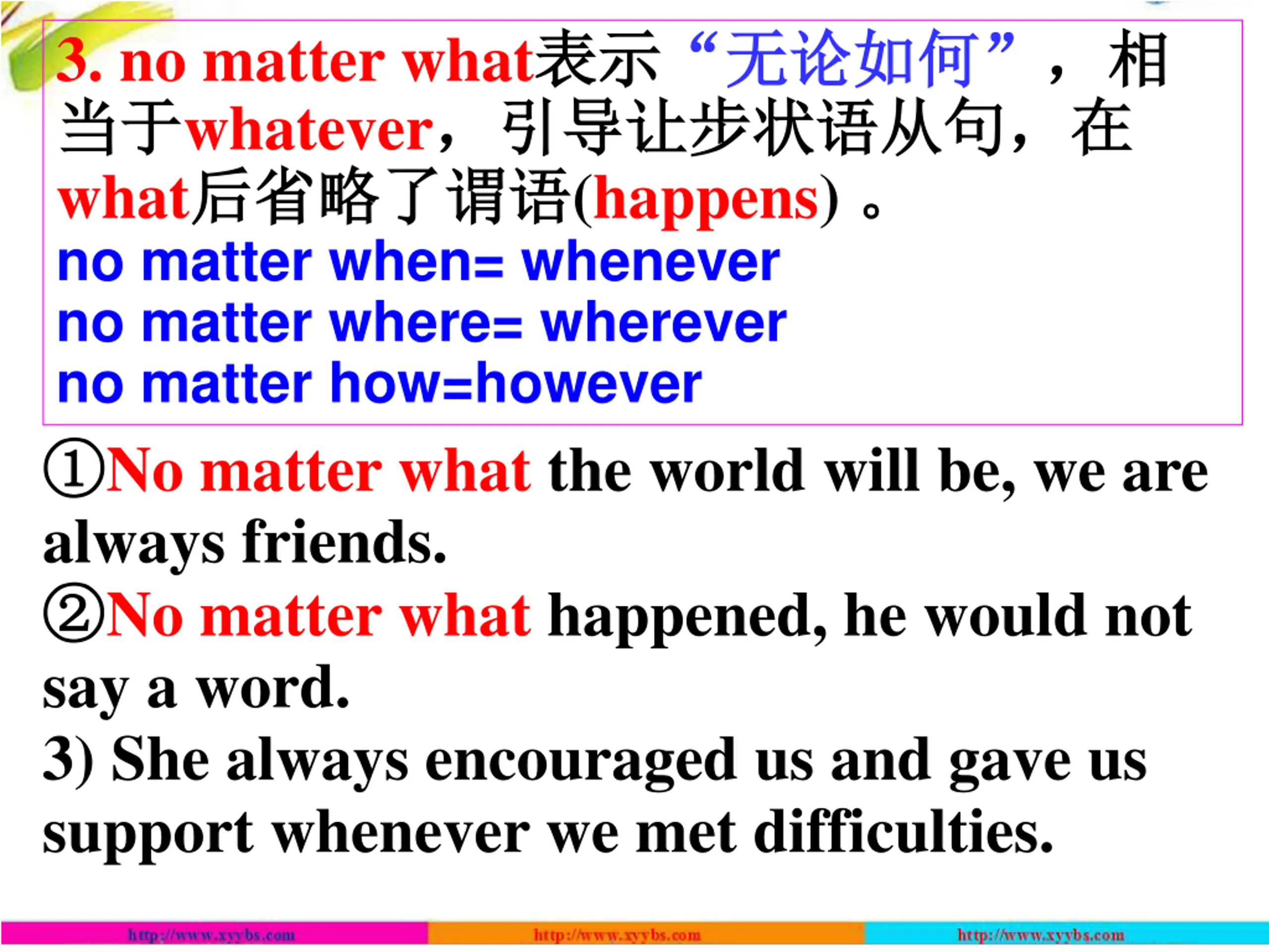 3. no matter what whatever what (happens) no matter when= whenever no matter where= wherever no matter how=however No matter what the world will be, we are always friends. No matter what happened, he would not say a word. 3) She always encouraged us and gave us support whenever we met difficulties.