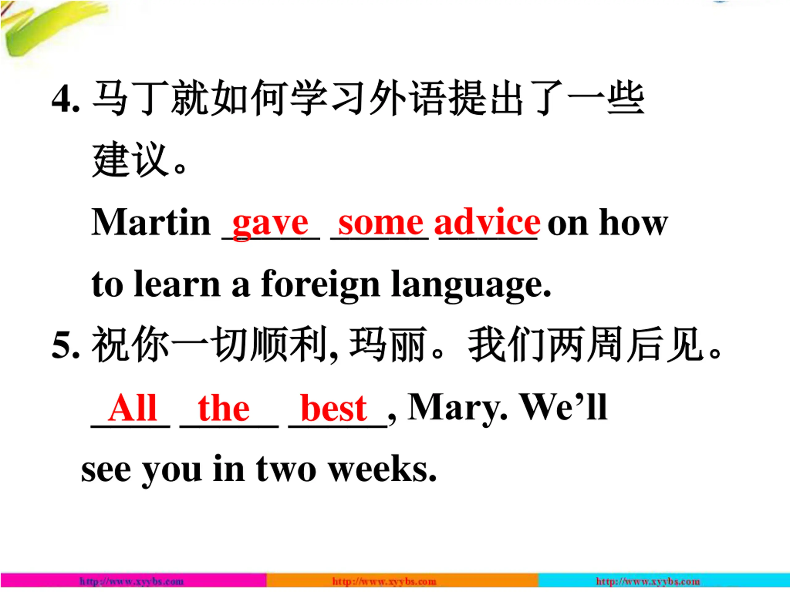 4. Martin _____ _____ _____ on how to learn a foreign language. 5. , ____ _____ _____, Mary. We ll see you in two weeks. gave some advice All the best
