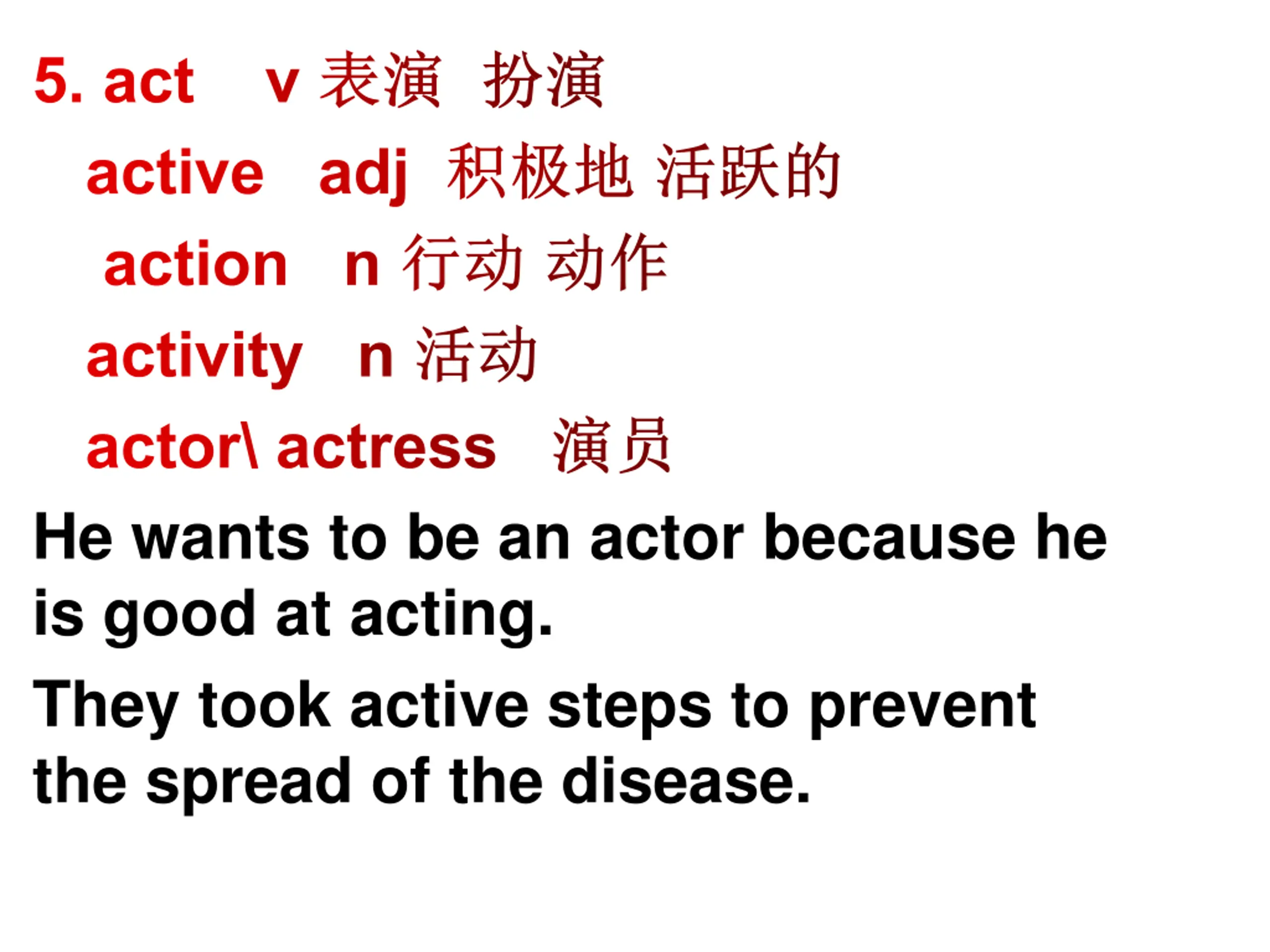 5. act v active adj action n activity n actor\ actress He wants to be an actor because he is good at acting. They took active steps to prevent the spread of the disease.