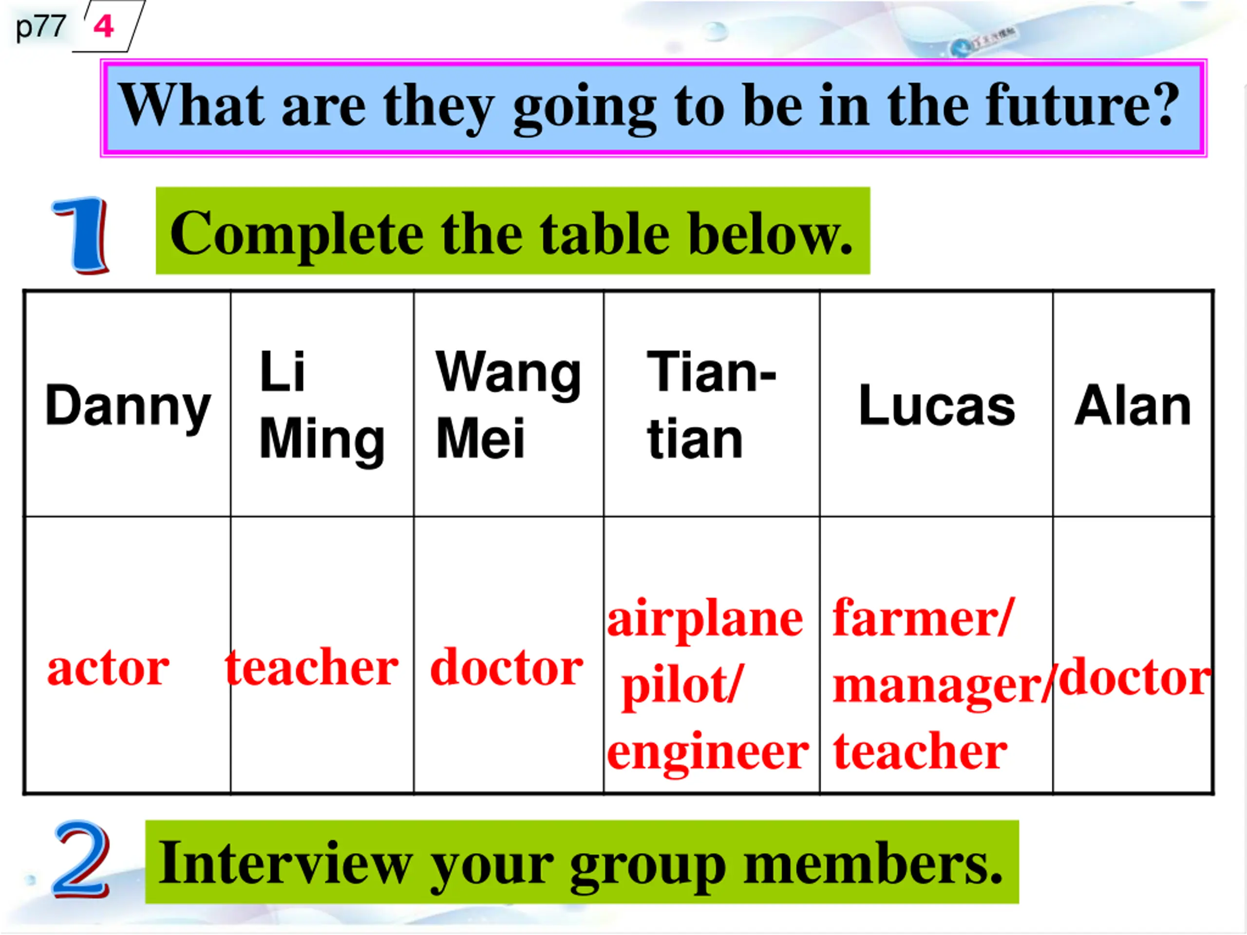 4 p77 What are they going to be in the future? Complete the table below. 1 1 Li Ming Wang Mei Tian- tian Danny Lucas Alan airplane pilot/ engineer farmer/ manager/ teacher actor teacher doctor doctor Interview your group members. 2