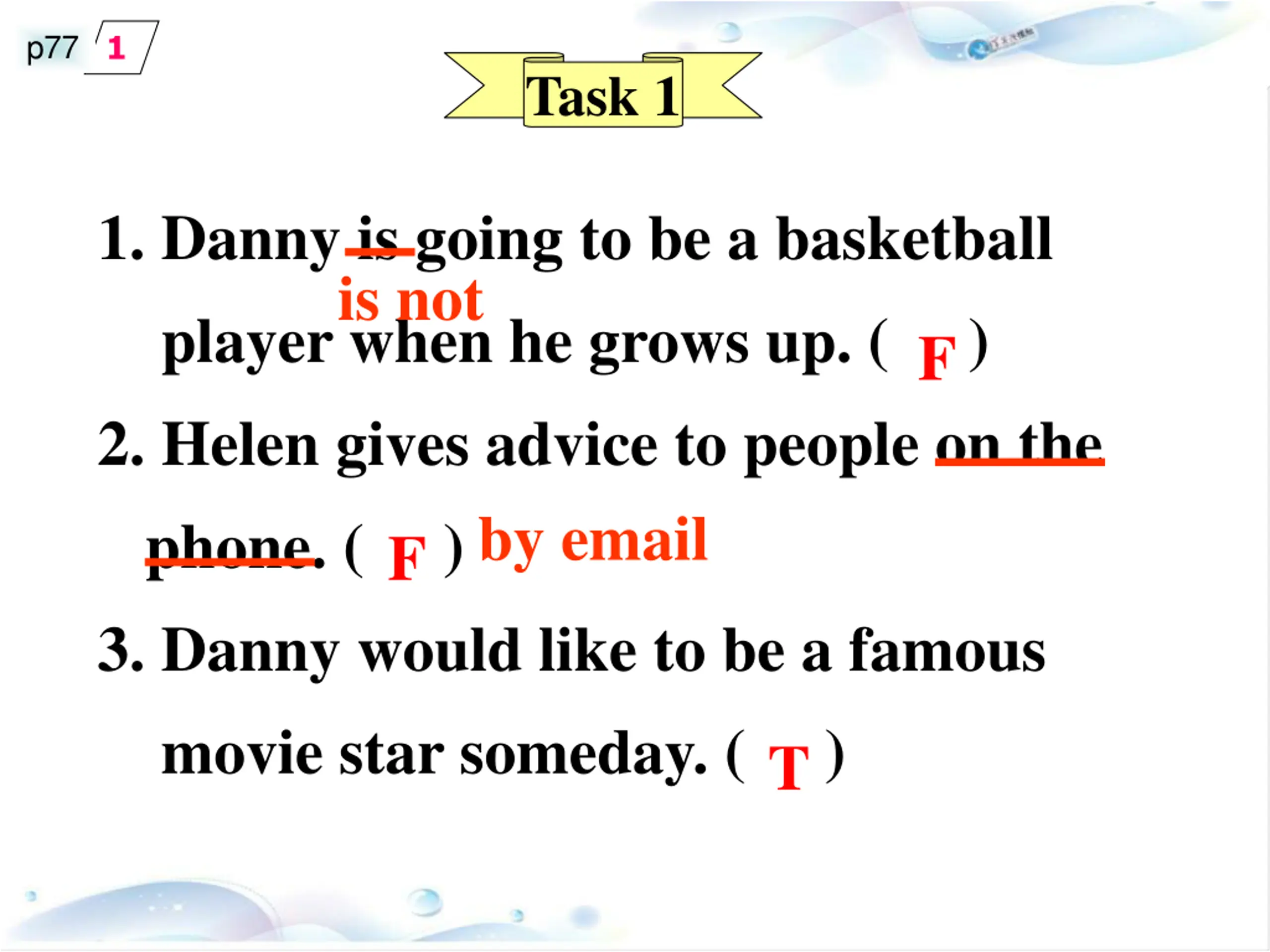 1 p77 Task 1 1. Danny is going to be a basketball player when he grows up. ( ) 2. Helen gives advice to people on the phone. ( ) 3. Danny would like to be a famous movie star someday. ( ) is not F by email F T