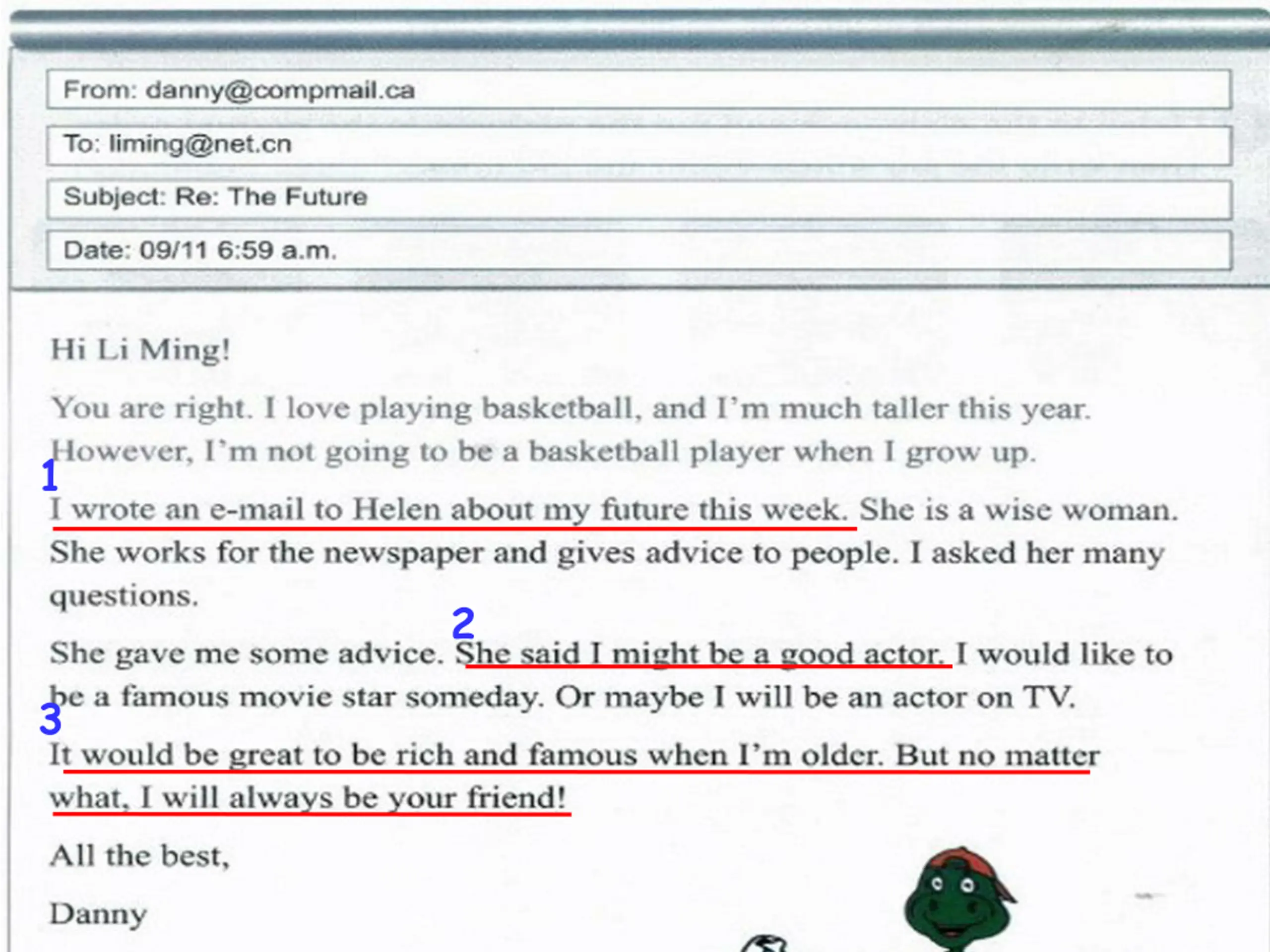 Li Ming wrote an e- mail to Danny about ambitions and dreams. And he thought Danny would be a good basketball player when he is older.