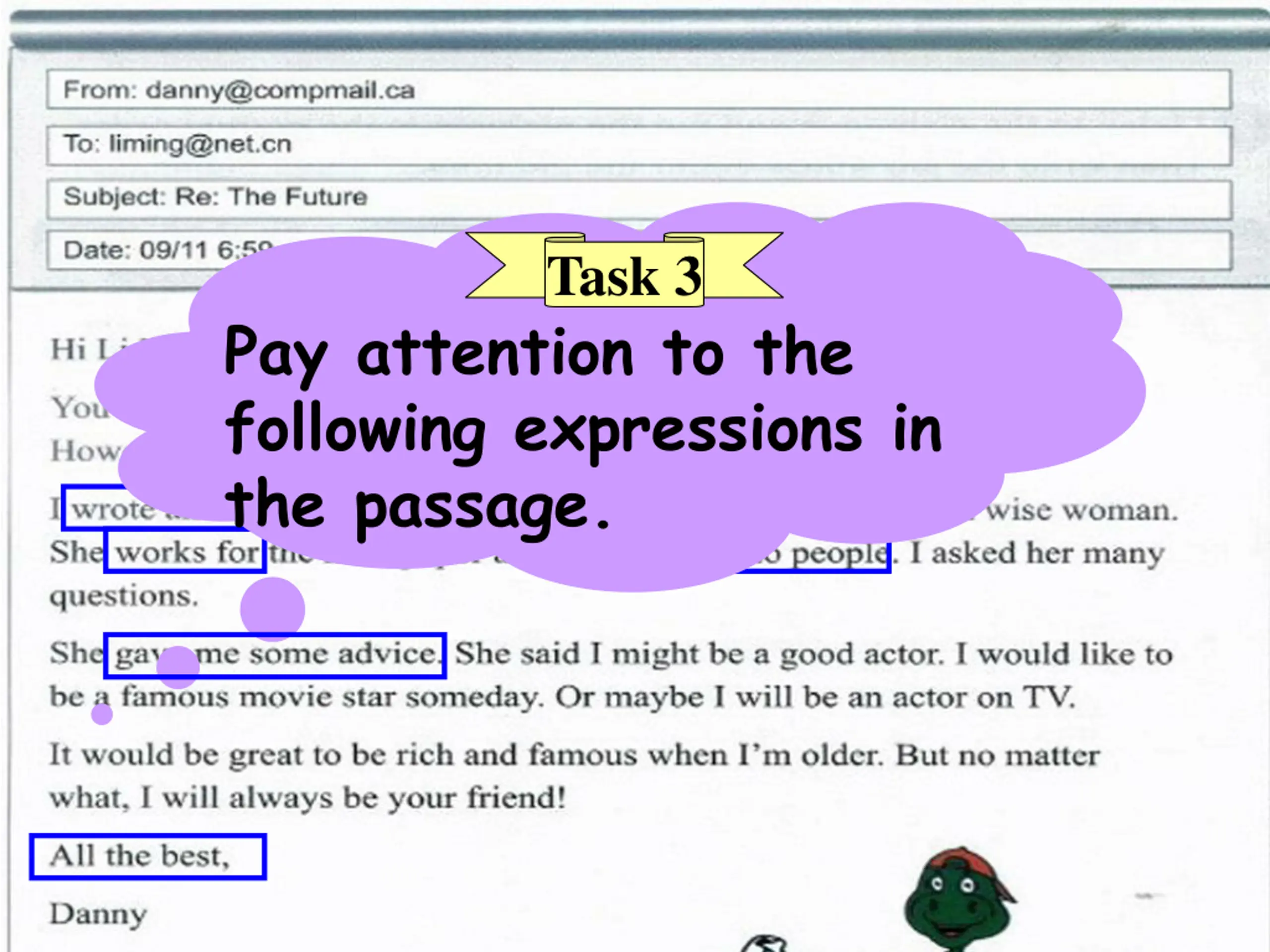 2 p77 Task2 Read the lesson and answer the questions. 1. What questions did Danny ask Helen? His future. 2. What s Helen s advice for Danny? She said Danny might be a good actor. 3. Will Danny and Li Ming be friends when they become rich? Yes, they will.
