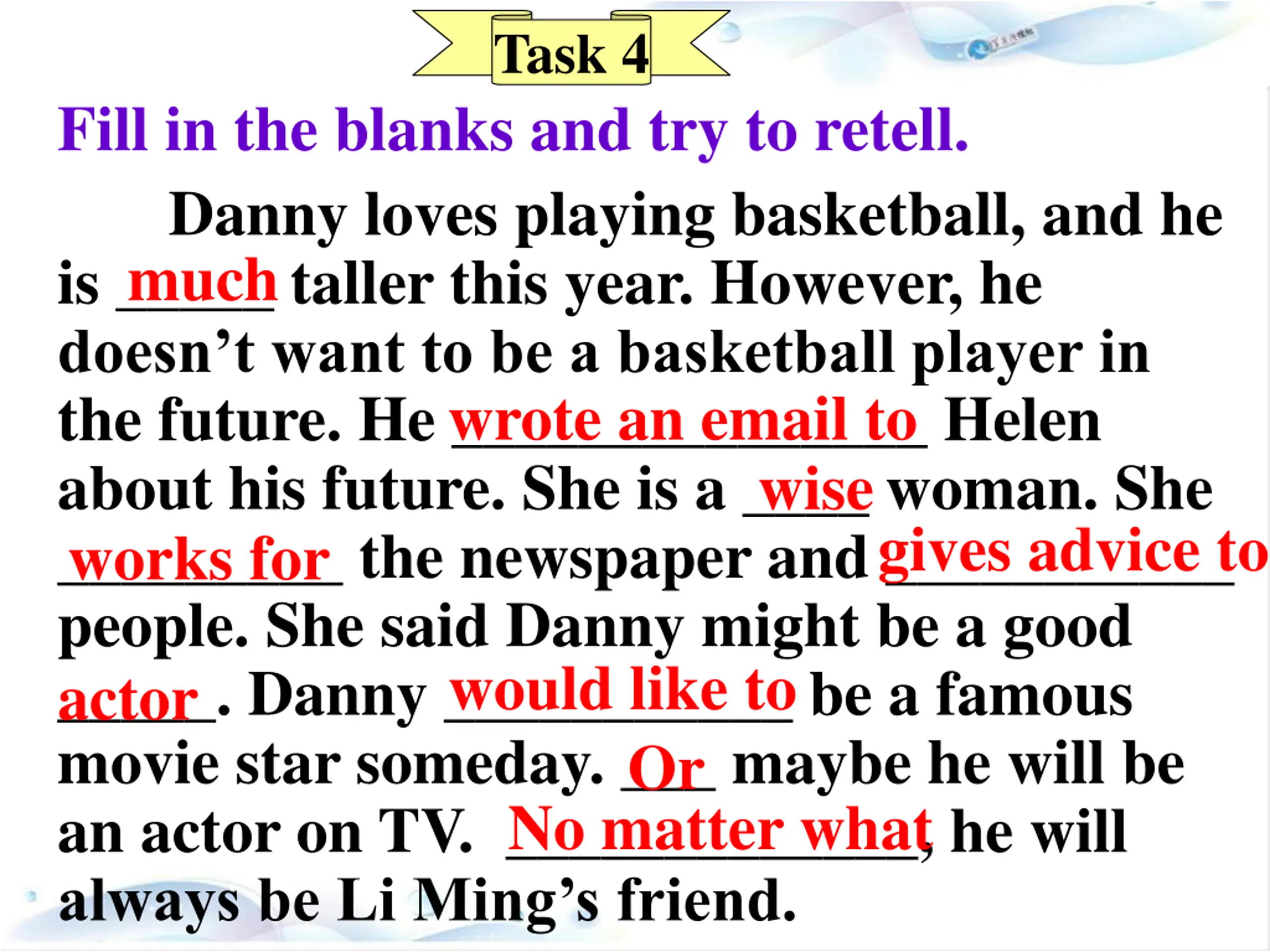 Task 4 Fill in the blanks and try to retell. Danny loves playing basketball, and he is _____ taller this year. However, he doesn t want to be a basketball player in the future. He _______________ Helen about his future. She is a ____ woman. She _________ the newspaper and ___________ people. She said Danny might be a good _____. Danny ___________ be a famous movie star someday. ___ maybe he will be an actor on TV. _____________, he will always be Li Ming s friend. much wrote an email to wise gives advice to works for would like to actor Or No matter what