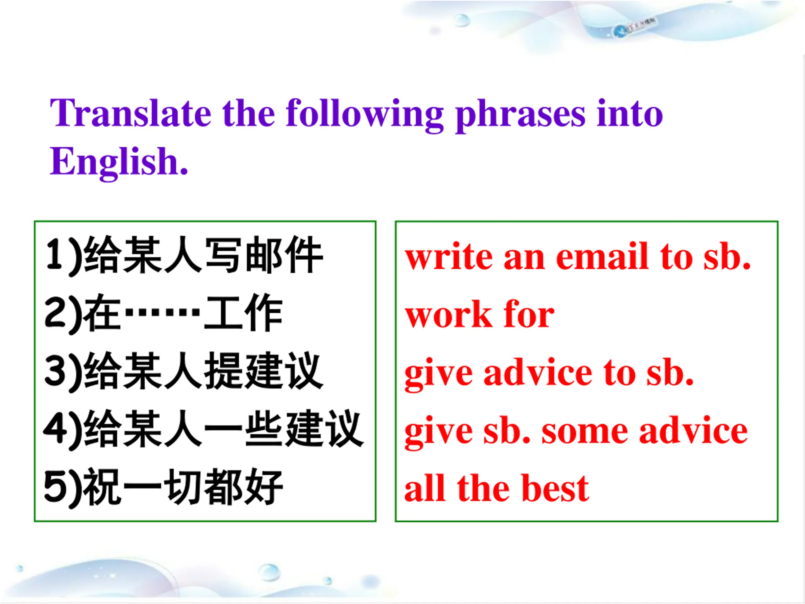 Translate the following phrases into English. 1) 2) 3) 4) 5) write an email to sb. work for give advice to sb. give sb. some advice all the best