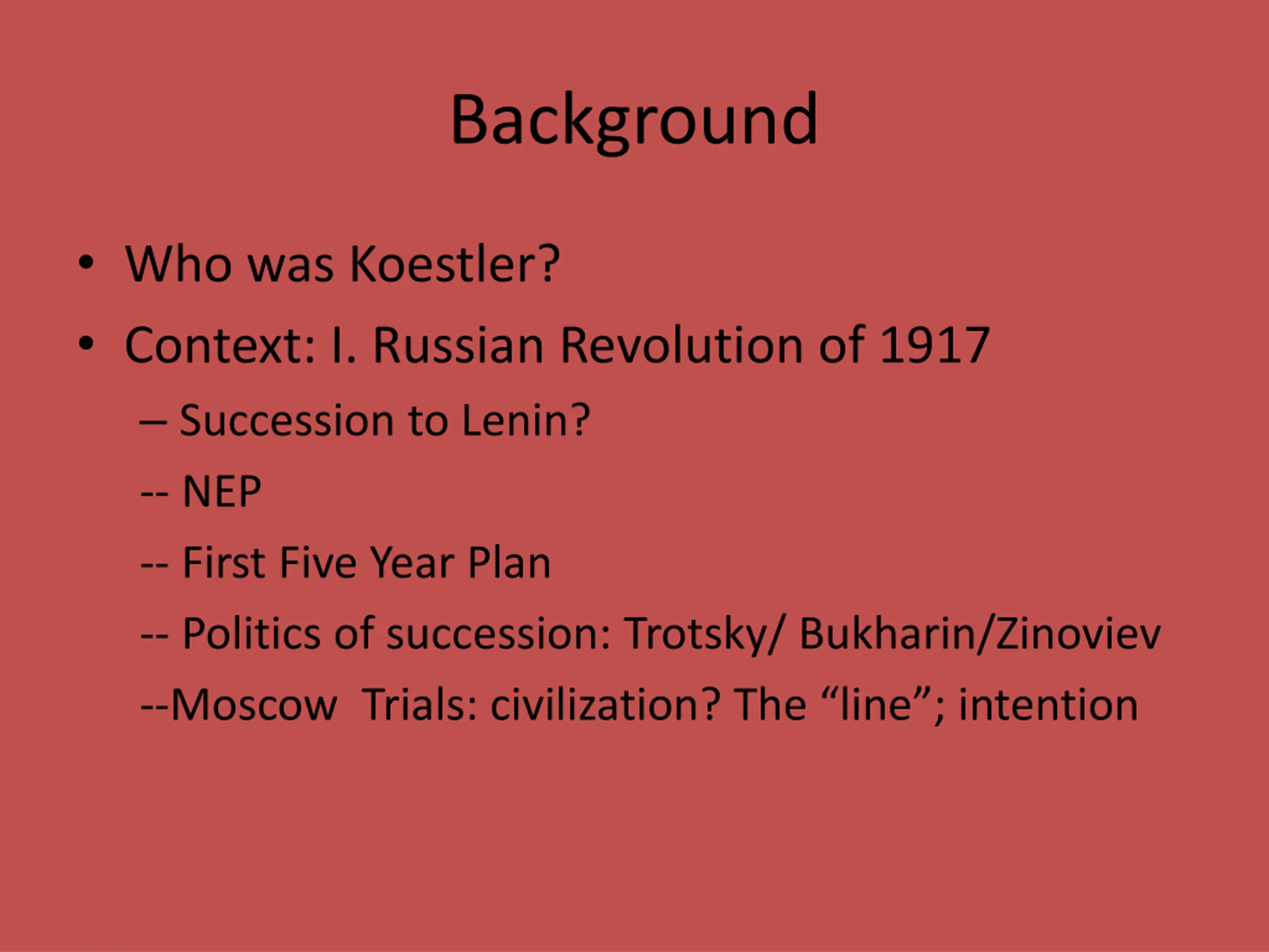 Background Who was Koestler? Context: I. Russian Revolution of 1917 Succession to Lenin? -- NEP -- First Five Year Plan -- Politics of succession: Trotsky/ Bukharin/Zinoviev --Moscow Trials: civilization? The line ; intention
