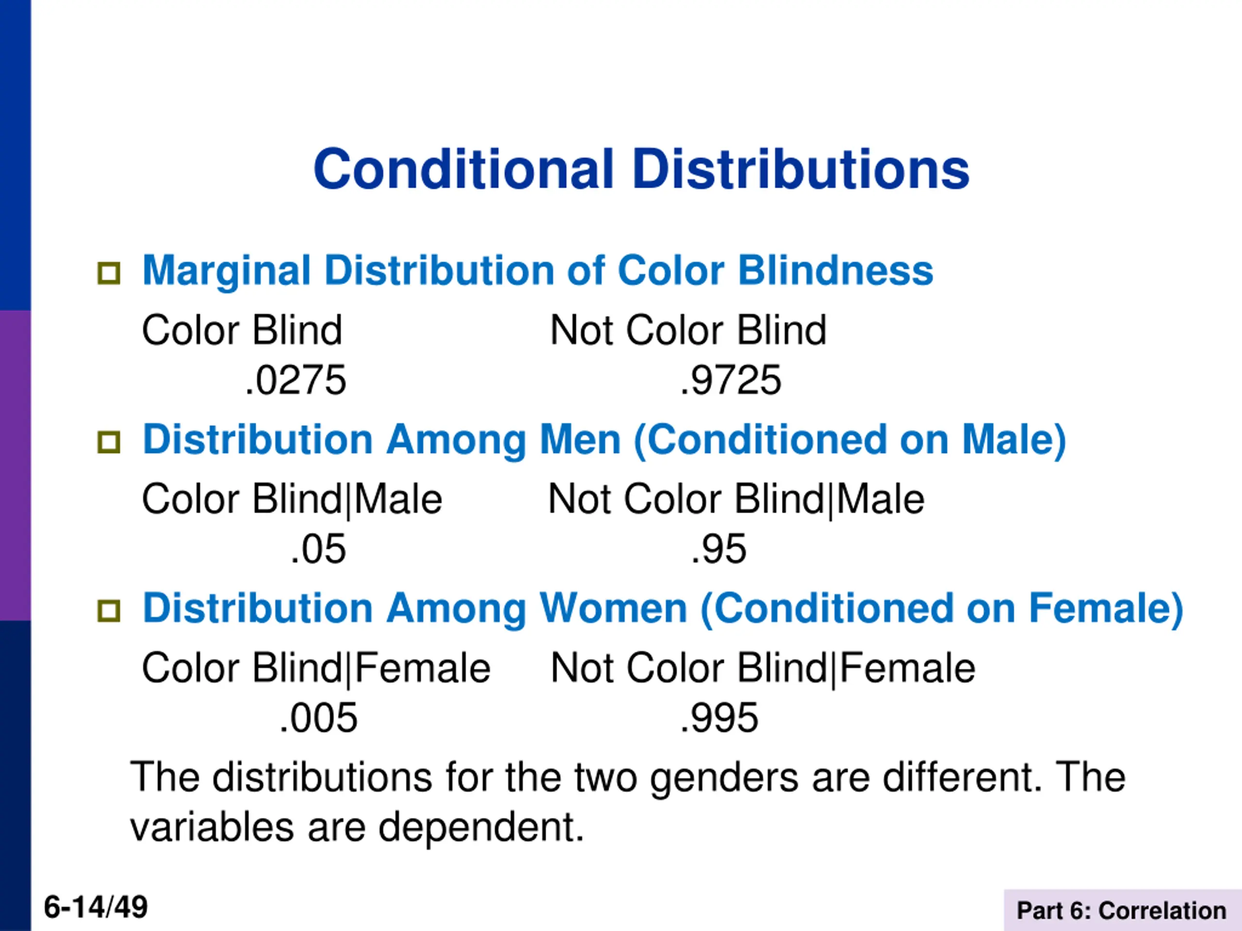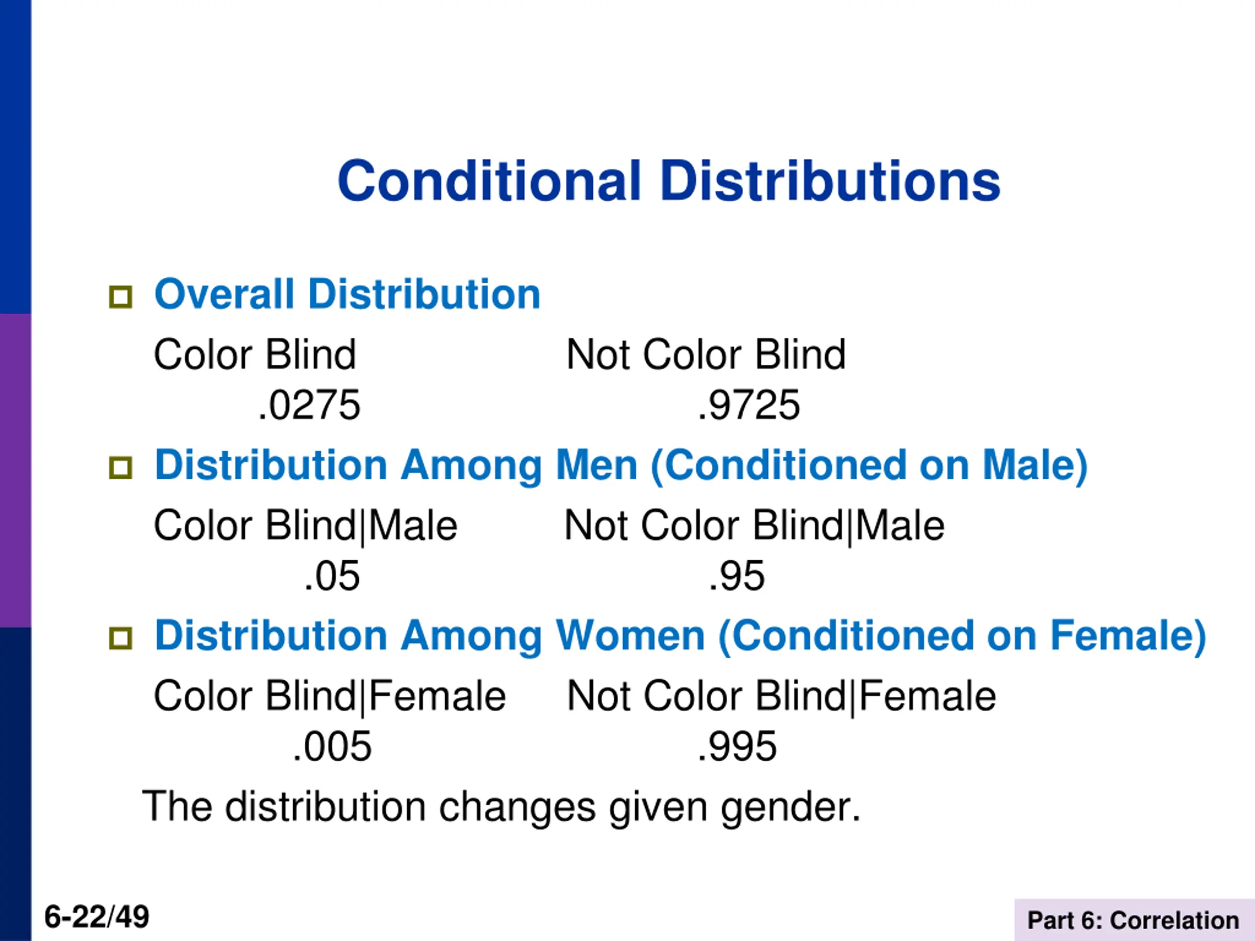 Conditional Distributions Overall Distribution Color Blind Not Color Blind .0275 .9725 Distribution Among Men (Conditioned on Male) Color Blind|Male Not Color Blind|Male .05 .95 Distribution Among Women (Conditioned on Female) Color Blind|Female Not Color Blind|Female .005 .995 The distribution changes given gender. 6-22/49 Part 6: Correlation