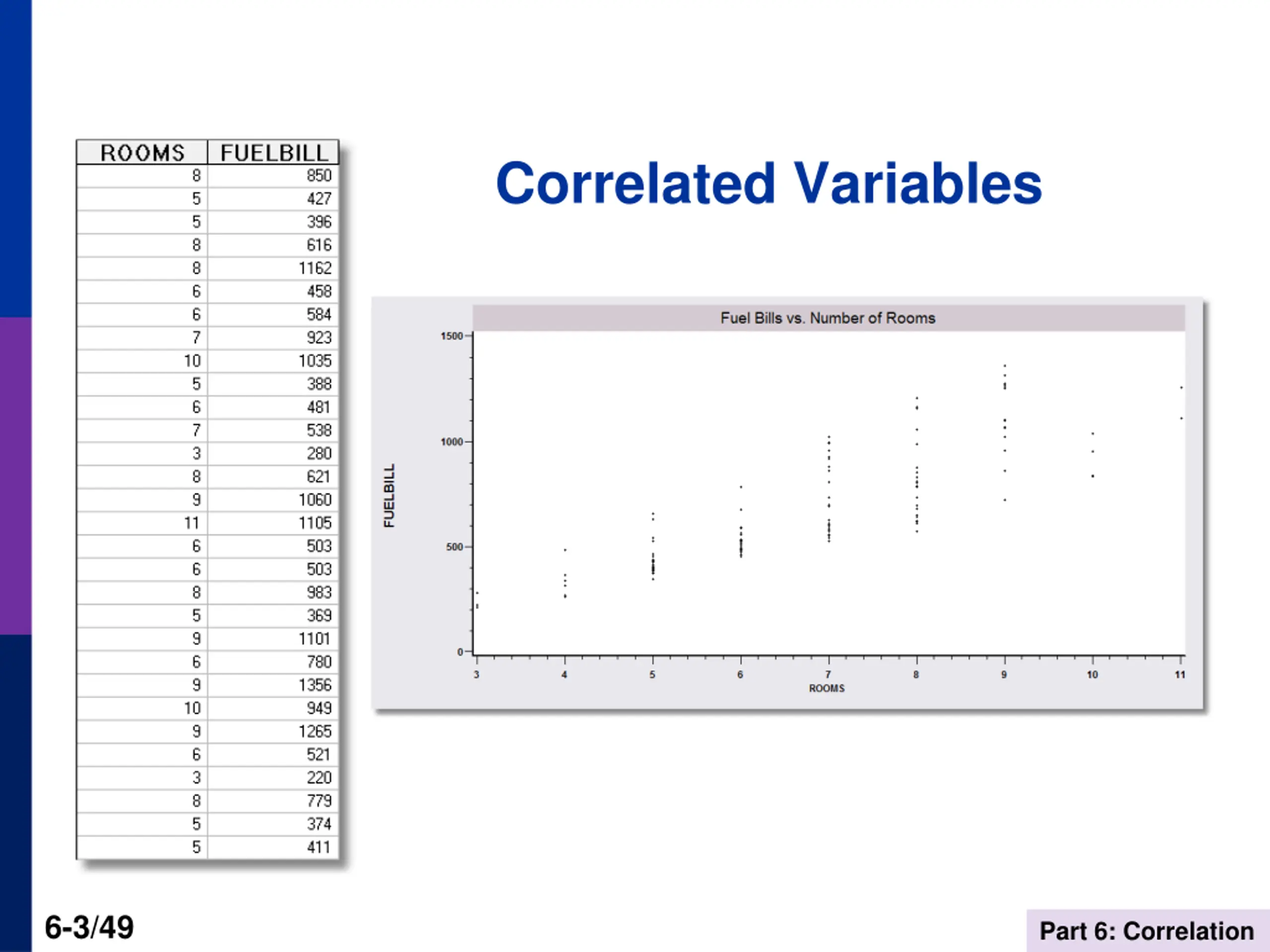 Positive Covariation: The distribution of one variable depends on another variable. Distribution of fuel bills changes (moves upward) as the number of rooms changes (increases). The per capita number of cars varies (positively) with per capita income. The relationship varies by country as well. 6-17/49 Part 6: Correlation