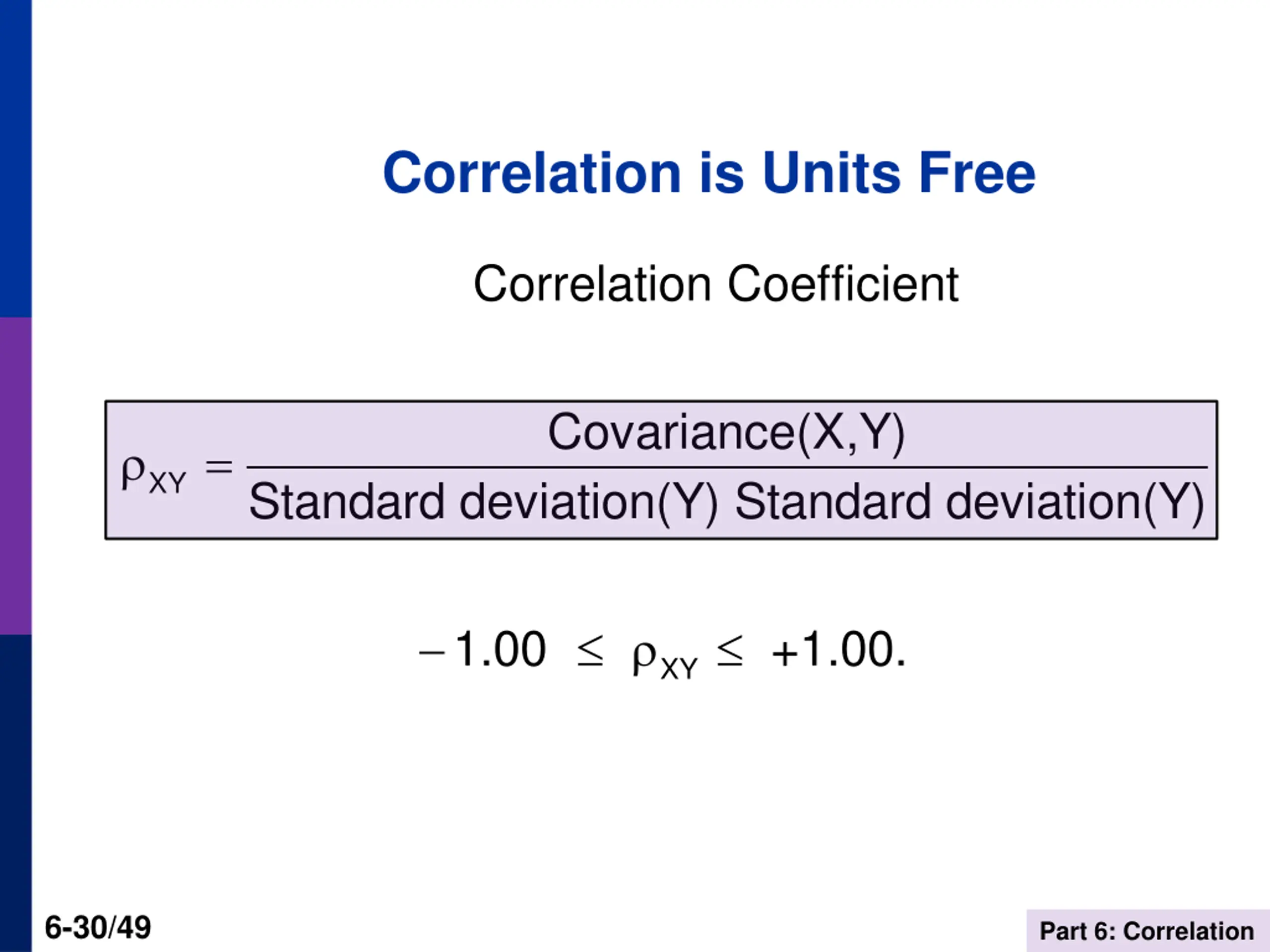 Correlation is Units Free Correlation Coefficient Covariance(X,Y) = XY Standard deviation(Y) Standard deviation(Y) 1.00 +1.00. XY 6-30/49 Part 6: Correlation