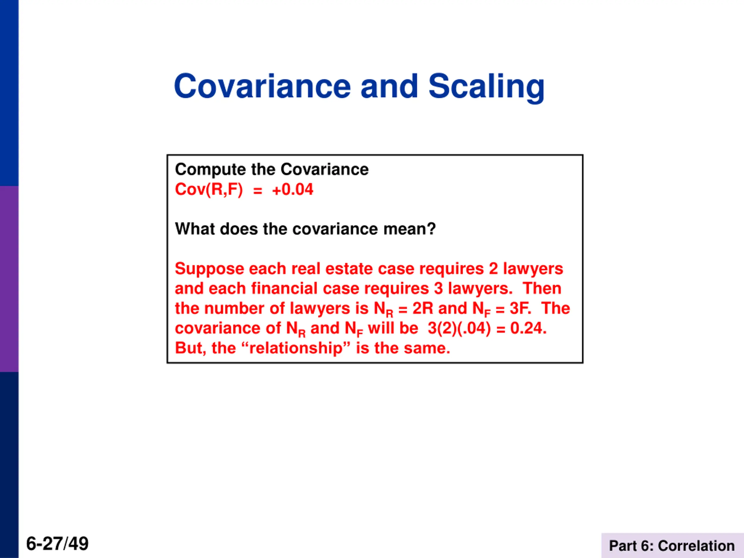 Covariance and Scaling Compute the Covariance Cov(R,F) = +0.04 What does the covariance mean? Suppose each real estate case requires 2 lawyers and each financial case requires 3 lawyers. Then the number of lawyers is NR = 2R and NF = 3F. The covariance of NR and NF will be 3(2)(.04) = 0.24. But, the relationship is the same. 6-27/49 Part 6: Correlation