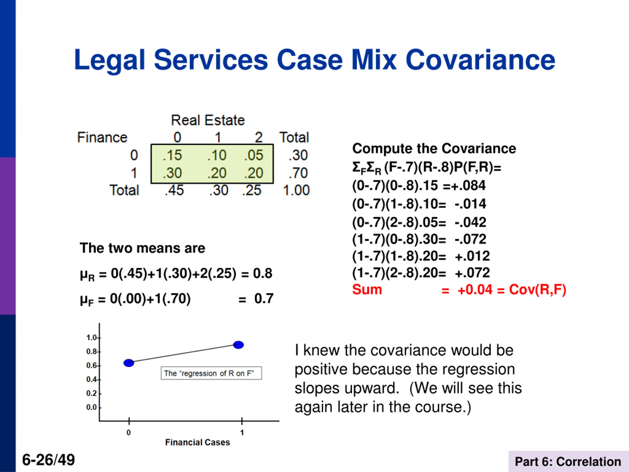 Legal Services Case Mix Covariance Compute the Covariance F R (F-.7)(R-.8)P(F,R)= (0-.7)(0-.8).15 =+.084 (0-.7)(1-.8).10= -.014 (0-.7)(2-.8).05= -.042 (1-.7)(0-.8).30= -.072 (1-.7)(1-.8).20= +.012 (1-.7)(2-.8).20= +.072 Sum = +0.04 = Cov(R,F) The two means are R = 0(.45)+1(.30)+2(.25) = 0.8 F = 0(.00)+1(.70) = 0.7 I knew the covariance would be positive because the regression slopes upward. (We will see this again later in the course.) 6-26/49 Part 6: Correlation