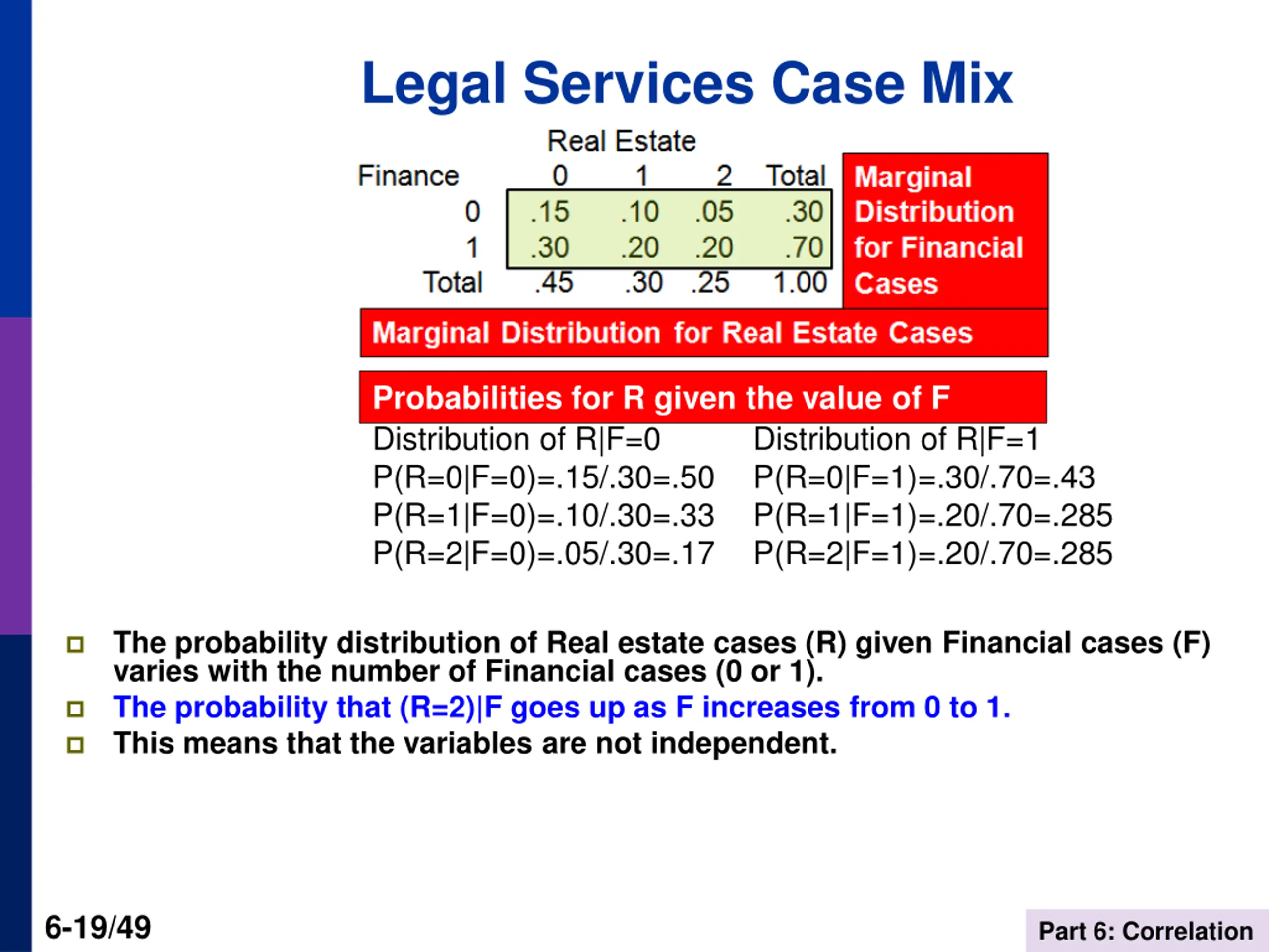 Legal Services Case Mix Probabilities for R given the value of F Distribution of R|F=0 P(R=0|F=0)=.15/.30=.50 P(R=1|F=0)=.10/.30=.33 P(R=2|F=0)=.05/.30=.17 Distribution of R|F=1 P(R=0|F=1)=.30/.70=.43 P(R=1|F=1)=.20/.70=.285 P(R=2|F=1)=.20/.70=.285 The probability distribution of Real estate cases (R) given Financial cases (F) varies with the number of Financial cases (0 or 1). The probability that (R=2)|F goes up as F increases from 0 to 1. This means that the variables are not independent. 6-19/49 Part 6: Correlation