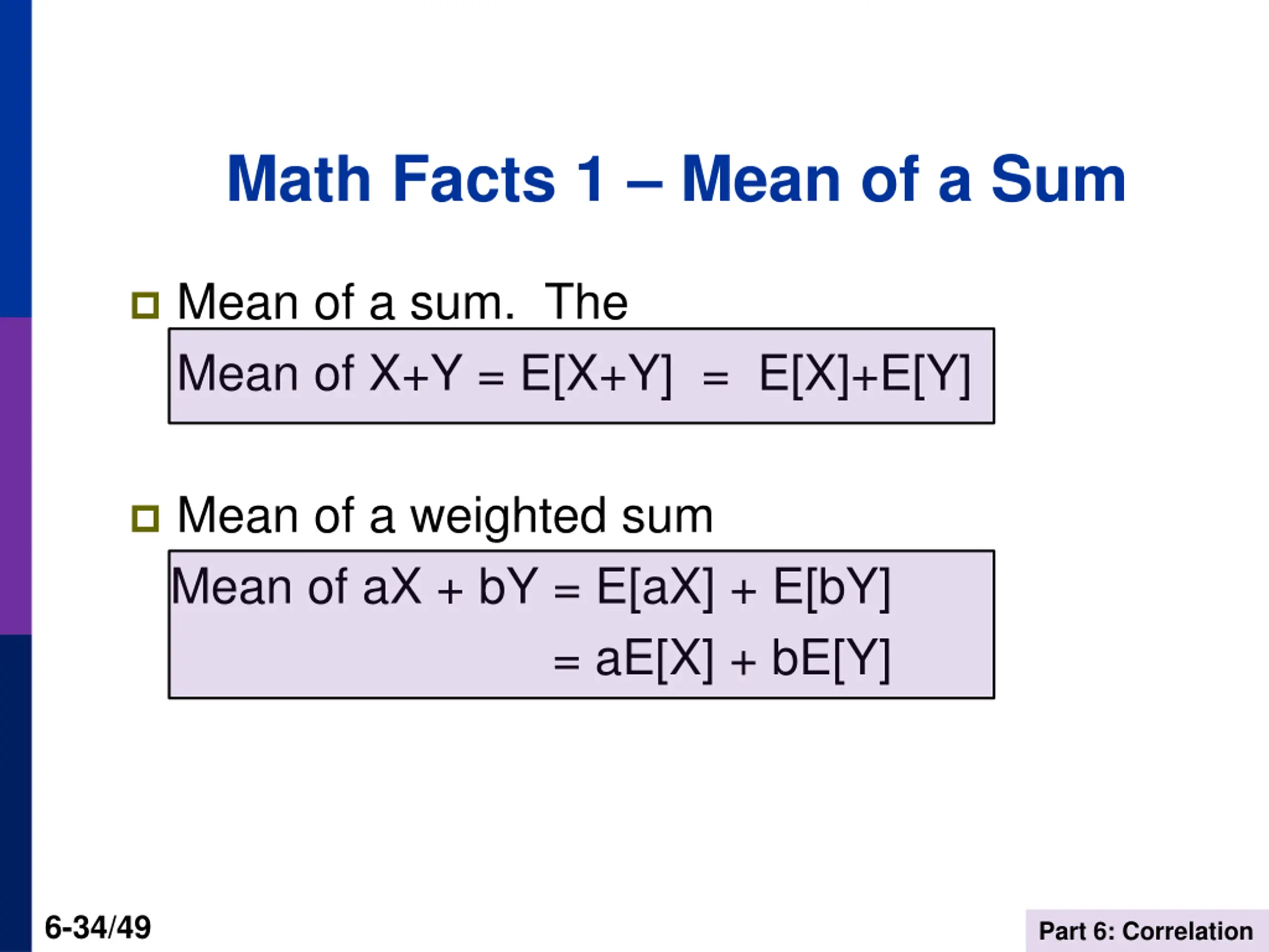 Math Facts 1 Mean of a Sum Mean of a sum. The Mean of X+Y = E[X+Y] = E[X]+E[Y] Mean of a weighted sum Mean of aX + bY = E[aX] + E[bY] = aE[X] + bE[Y] 6-34/49 Part 6: Correlation
