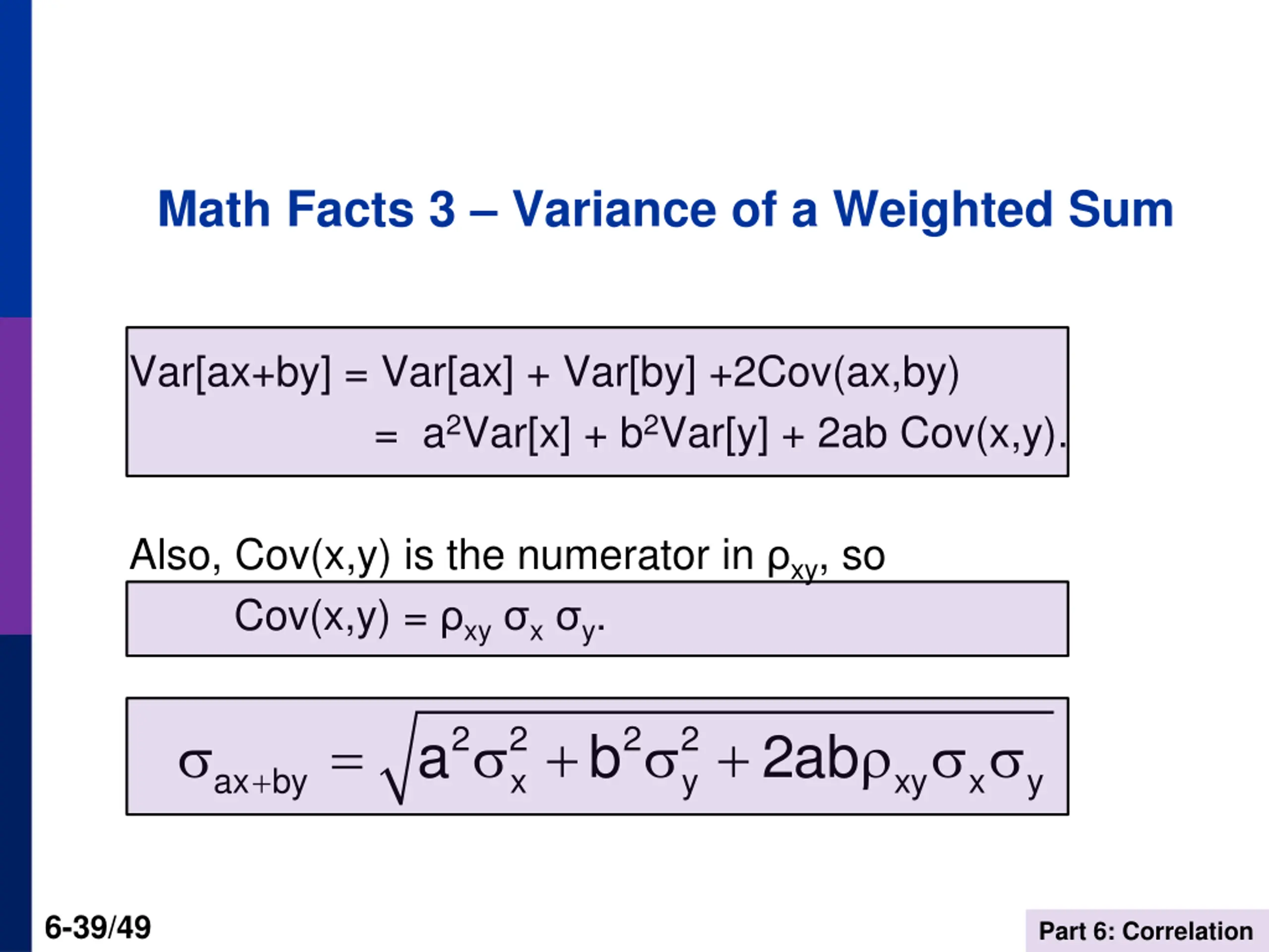 Math Facts 3 Variance of a Weighted Sum Var[ax+by] = Var[ax] + Var[by] +2Cov(ax,by) = a2Var[x] + b2Var[y] + 2ab Cov(x,y). Also, Cov(x,y) is the numerator in xy, so Cov(x,y) = xy x y. = + + 2 2 x 2 2 y a b 2ab ax by + xy x y 6-39/49 Part 6: Correlation
