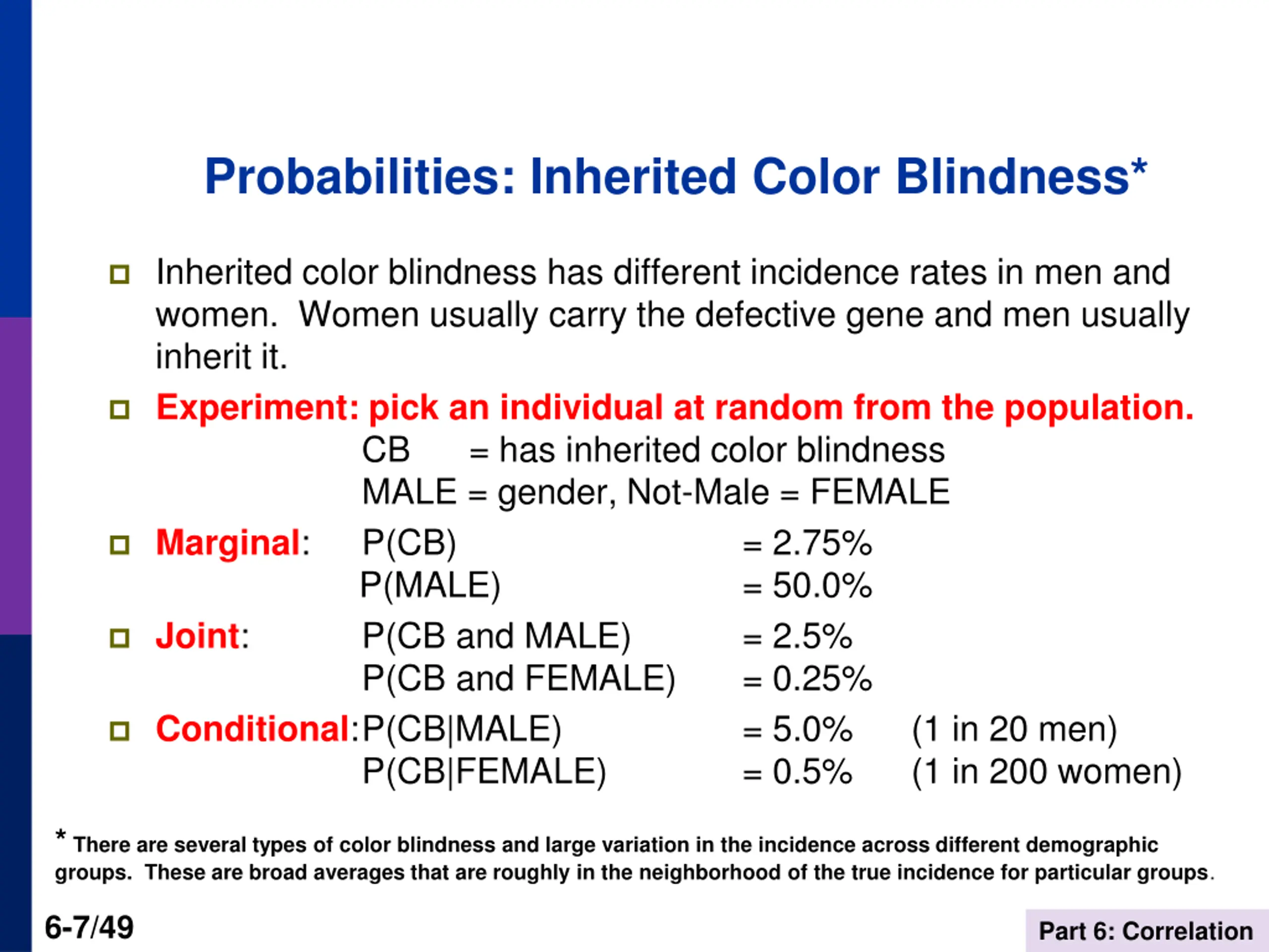Probabilities: Inherited Color Blindness* Inherited color blindness has different incidence rates in men and women. Women usually carry the defective gene and men usually inherit it. Experiment: pick an individual at random from the population. CB = has inherited color blindness MALE = gender, Not-Male = FEMALE Marginal: P(CB) P(MALE) Joint: P(CB and MALE) P(CB and FEMALE) Conditional: P(CB|MALE) P(CB|FEMALE) = 2.75% = 50.0% = 2.5% = 0.25% = 5.0% (1 in 20 men) = 0.5% (1 in 200 women) * There are several types of color blindness and large variation in the incidence across different demographic groups. These are broad averages that are roughly in the neighborhood of the true incidence for particular groups. 6-7/49 Part 6: Correlation
