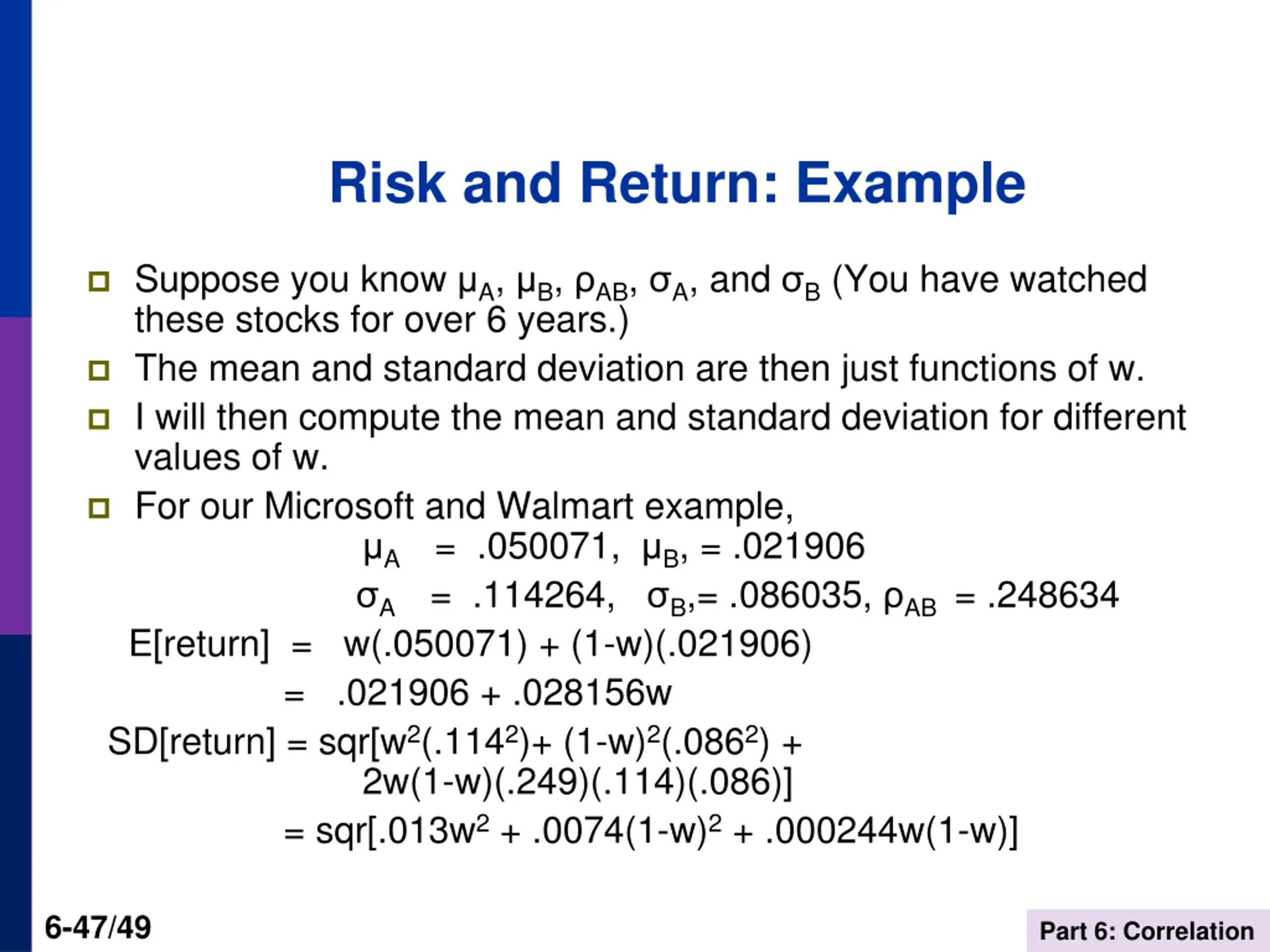 Risk and Return: Example Suppose you know A, B, AB, A, and B (You have watched these stocks for over 6 years.) The mean and standard deviation are then just functions of w. I will then compute the mean and standard deviation for different values of w. For our Microsoft and Walmart example, A = .050071, B, = .021906 A = .114264, B,= .086035, AB = .248634 E[return] = w(.050071) + (1-w)(.021906) = .021906 + .028156w SD[return] = sqr[w2(.1142)+ (1-w)2(.0862) + 2w(1-w)(.249)(.114)(.086)] = sqr[.013w2 + .0074(1-w)2 + .000244w(1-w)] 6-47/49 Part 6: Correlation