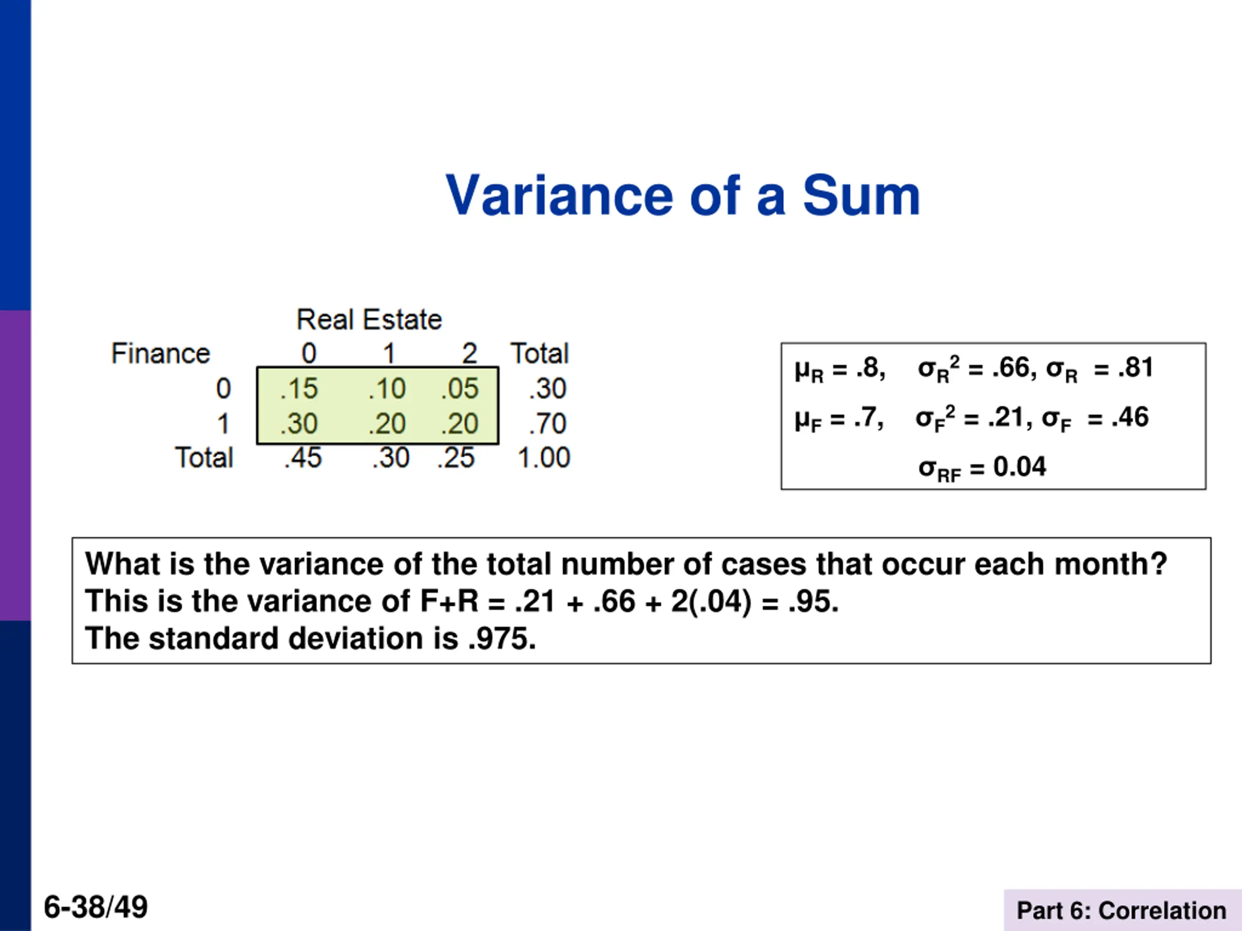Variance of a Sum R = .8, R2 = .66, R = .81 F = .7, F2 = .21, F = .46 RF = 0.04 What is the variance of the total number of cases that occur each month? This is the variance of F+R = .21 + .66 + 2(.04) = .95. The standard deviation is .975. 6-38/49 Part 6: Correlation