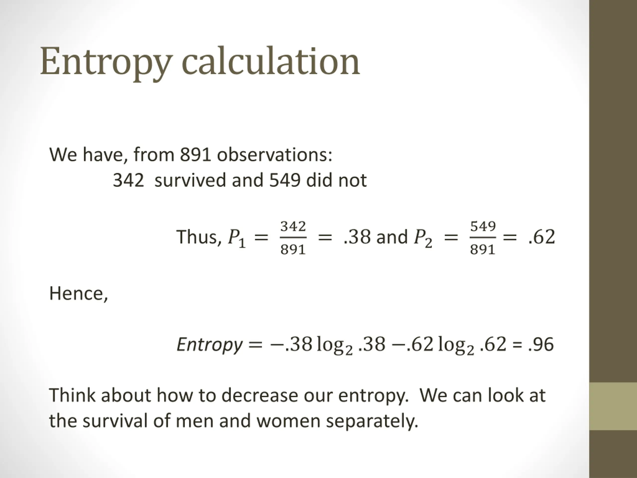 Entropy calculation We have, from 891 observations: 342 survived and 549 did not 342 891 = .38 and ?2 = 549 891= .62 Thus, ?1= Hence, Entropy = .38log2.38 .62log2.62 = .96 Think about how to decrease our entropy. We can look at the survival of men and women separately.