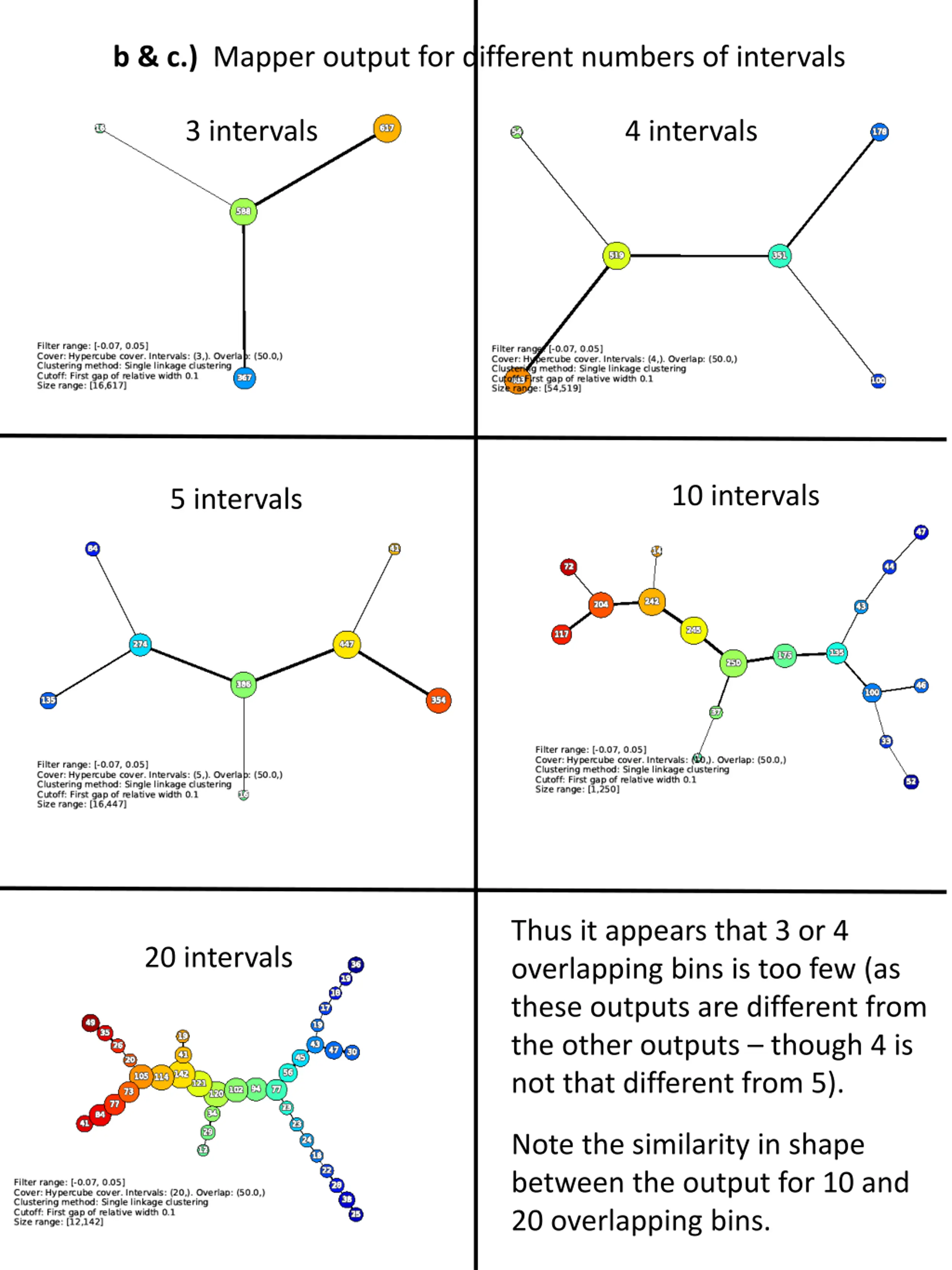 b & c.) Mapper output for different numbers of intervals 3 intervals 4 intervals 10 intervals 5 intervals Thus it appears that 3 or 4 overlapping bins is too few (as these outputs are different from the other outputs though 4 is not that different from 5). 20 intervals Note the similarity in shape between the output for 10 and 20 overlapping bins.